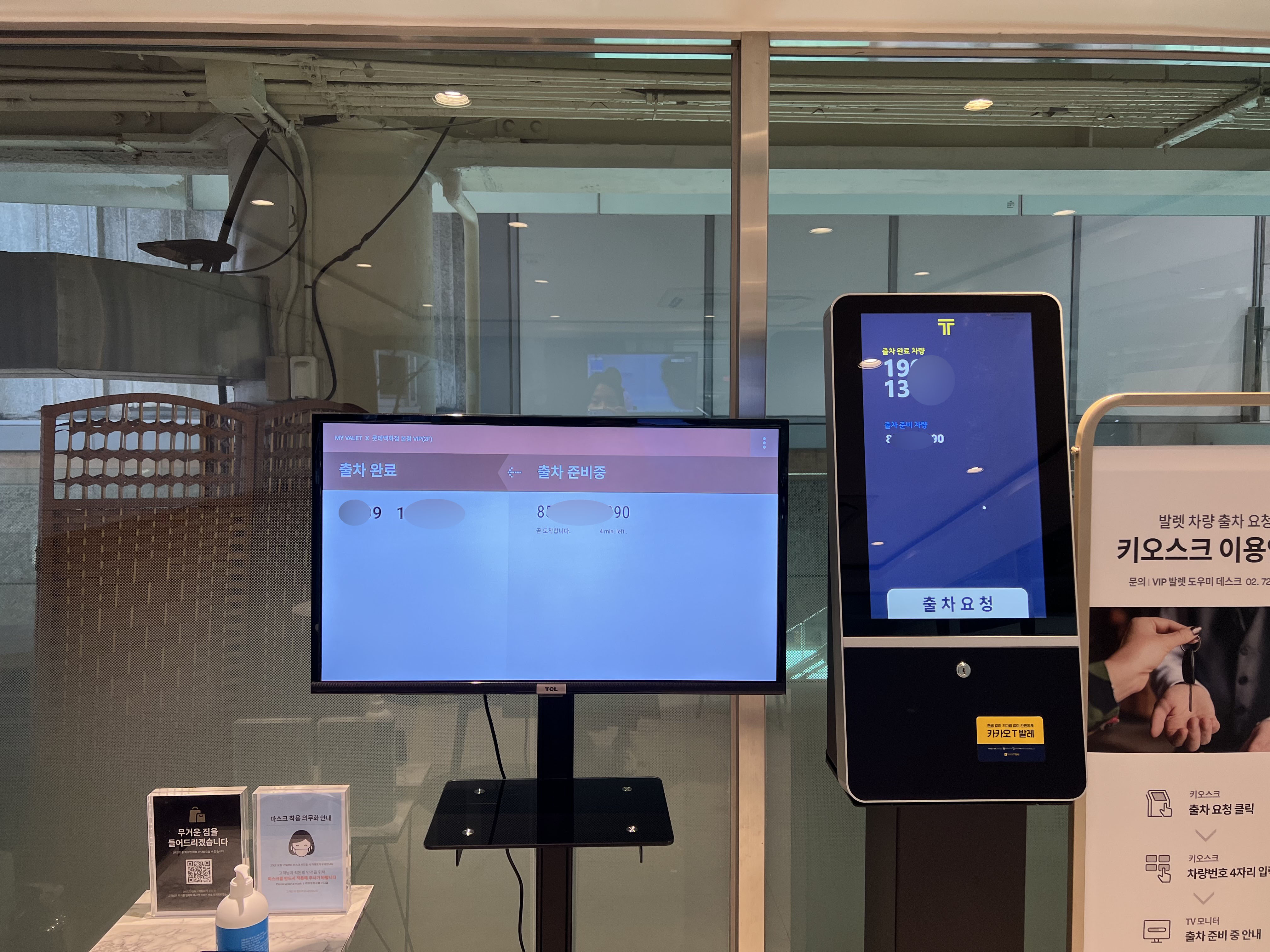 쇼핑을 마치고 발레파킹했던 장소로 가면 이렇게 출차 정보가 표기됩니다. 주차장 헤맬 필요도 없고 지하 깊숙이 차가 지러 내려갈 필요도 없고 너무 편리한 서비스예요. 다만 발레을 맡기면 기계식 주차장으로 입고되기 때문에, 기계식 주차장을 선호하지 않는 분들은 지하주차장을 이용해 달라는 안내가 있어요. 저는 기계식이건 지하주차장이건 제가 편한 걸 선호하는 사람이라 아주 공감이 안 갑니다만 참고해주시면 될 것 같아요.