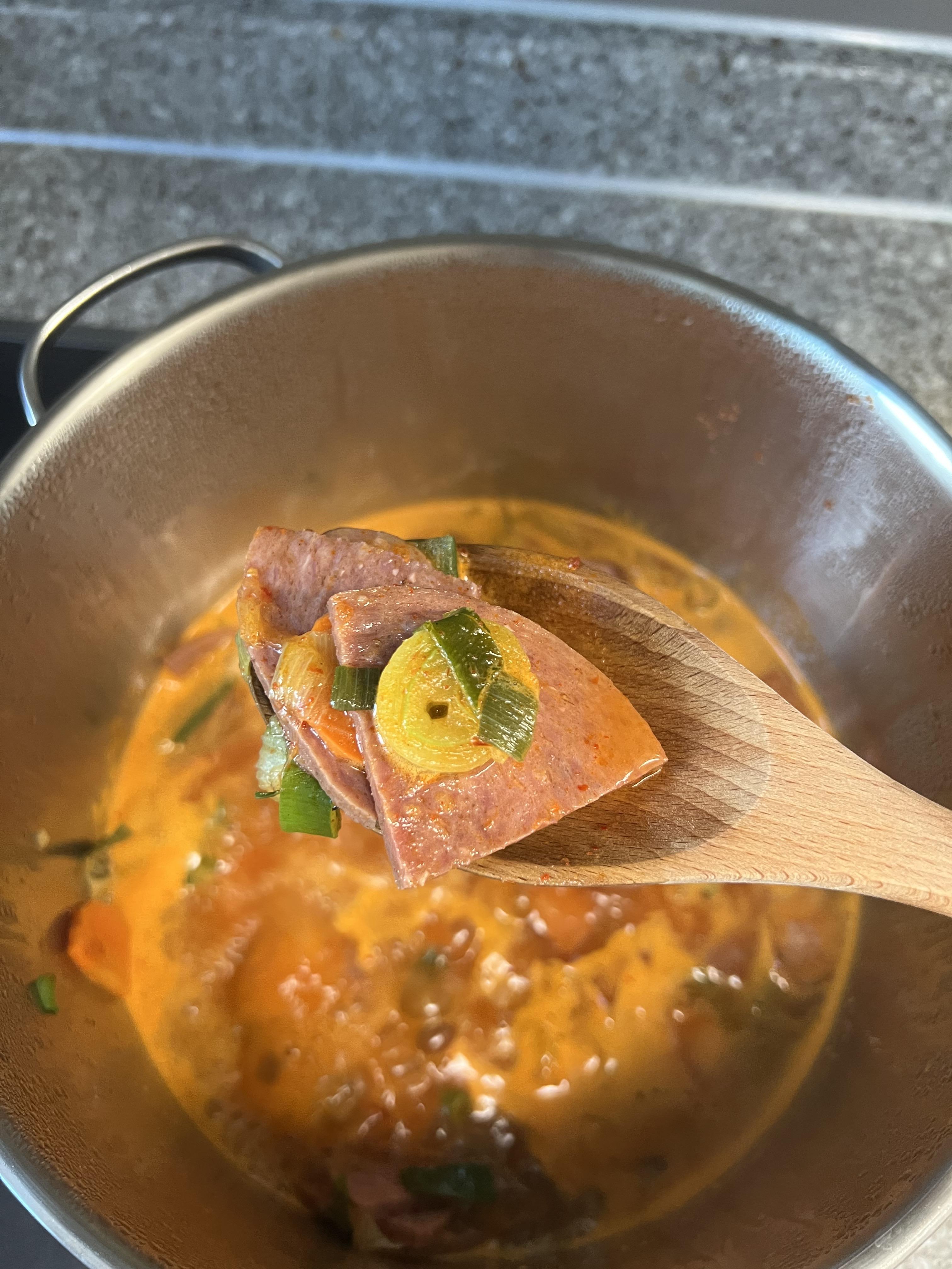 국물 맛은 약간 매콤하면서도 칼칼한 맛이지만 맵기의 정도, 간이 그렇게 자극적이지 않았습니다. 스팸을 넣었음에도 짜지 않아서 좋았어요. 깔끔한 부대찌개 맛이었으며, 오뎅식당 및 송탄 부대찌개와 같이 유명 부대찌개 맛집 수준은 아니었지만 레토르트 치곤 꽤 훌륭했습니다. 기본적으로 들어가 있는 햄도 꽤나 들어 있고 맛도 좋았습니다. 개인적으로 짜게 먹는 편이라 다소 심심한 맛으로 생각이 들었는데요. 여기에 치즈를 추가했으면 더 훌륭한 맛이었을텐데 아쉬운 생각이 드네요.. 나중에 또 사먹게 되면 치즈를 넣어봐야겠다는 생각을 했습니다. 아무튼 투자한 시간과 가격 대비 모두 만족했으며, 한 끼 맛있게 때우기 좋아서 재구매 의사는 100%입니다. 이상 오늘도 긴 리뷰를 읽어주셔서 감사합니다.