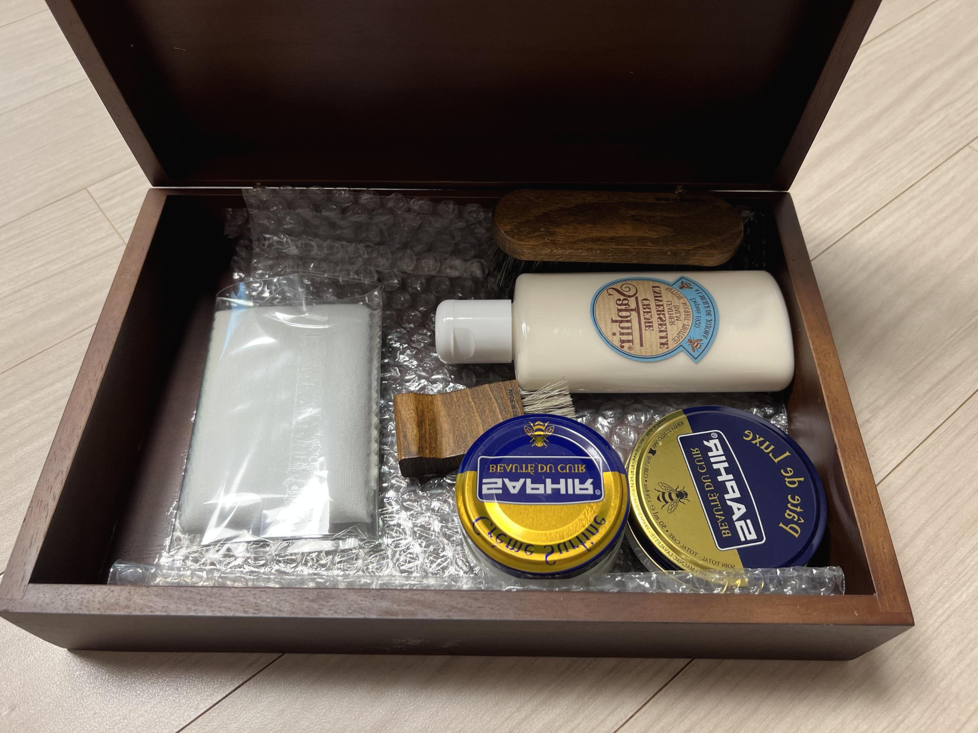개인적으로 필요성이 없어 보이는 광택 크림, 클렌징 기능에 집중되기 보다 영양 공급이 더 잘되는 것 같은 유니버셜 크림 정도가 아쉬워 보입니다만, 모든 것을 개별로 구입하기 부담되고, 귀찮을 땐 최선의 선택지로 생각됩니다. 저는 별도로 영양 공급 크림과 스웨이드 케어용품을 추가로 구매했는데요. 가격 압박이 상당하지만, 한 번 장만해놓으면 오래 쓰니까 위안을 삼으려고 합니다 ㅠㅠ 아무튼 사피르 원목 슈케어 박스 세트 키트 적극 추천드립니다.