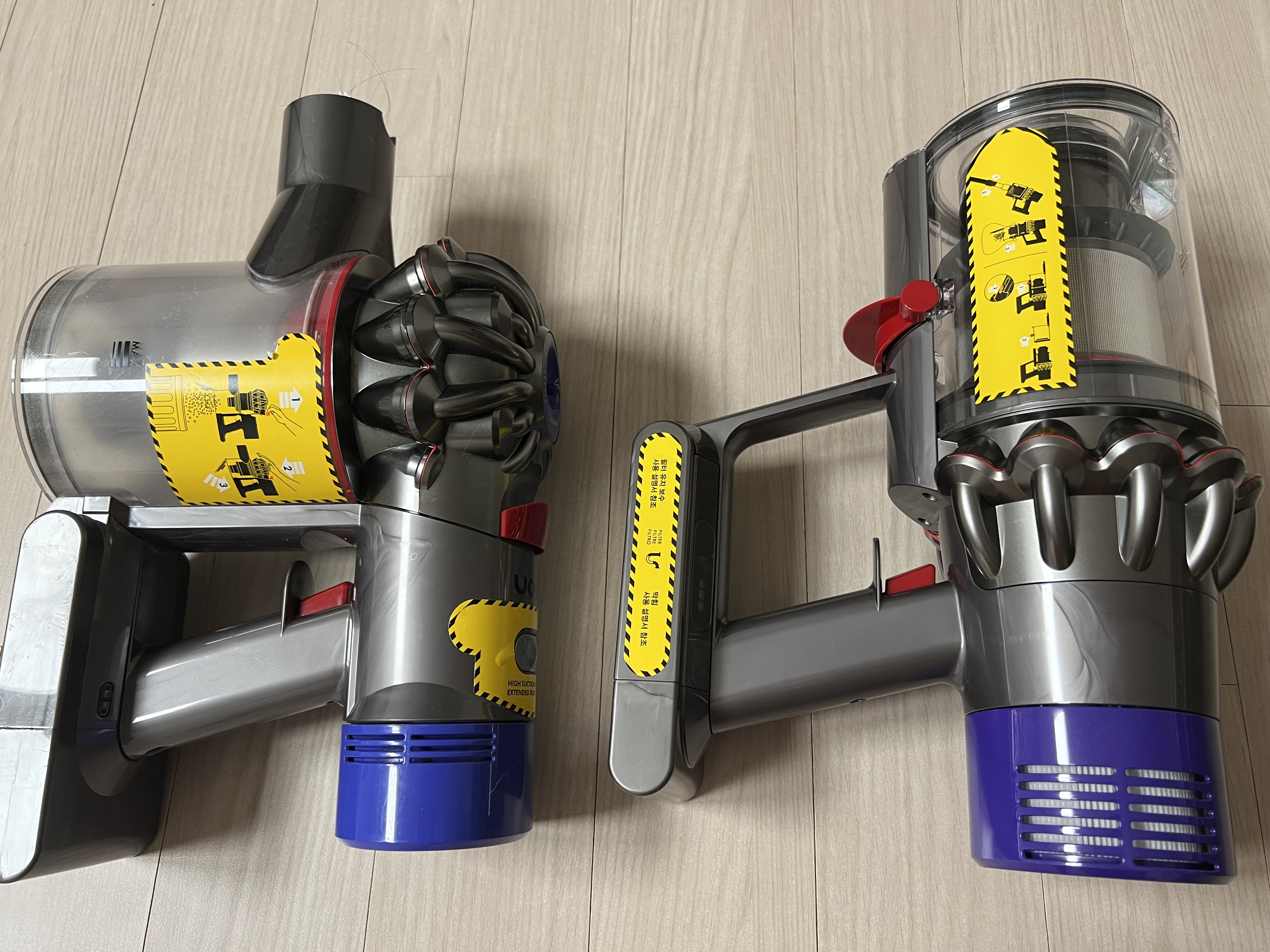 왼쪽에 있는 제품이 v8이고, 오른쪽에 있는 제품이 v10입니다. 두 제품을 한 번에 보니 차이점이 확연히 보이는데요, 확실히 v10이 필터 통이 커지고 세분화된 느낌이고 그립감이 훨씬 좋아졌습니다. 그리고 무엇보다 새롭게 초미세먼지 필터가 생겼으므로, 주기적으로 필터 청소도 해주어야 합니다. 그건 다음번 포스팅에서 자세히 포스팅해볼게요.