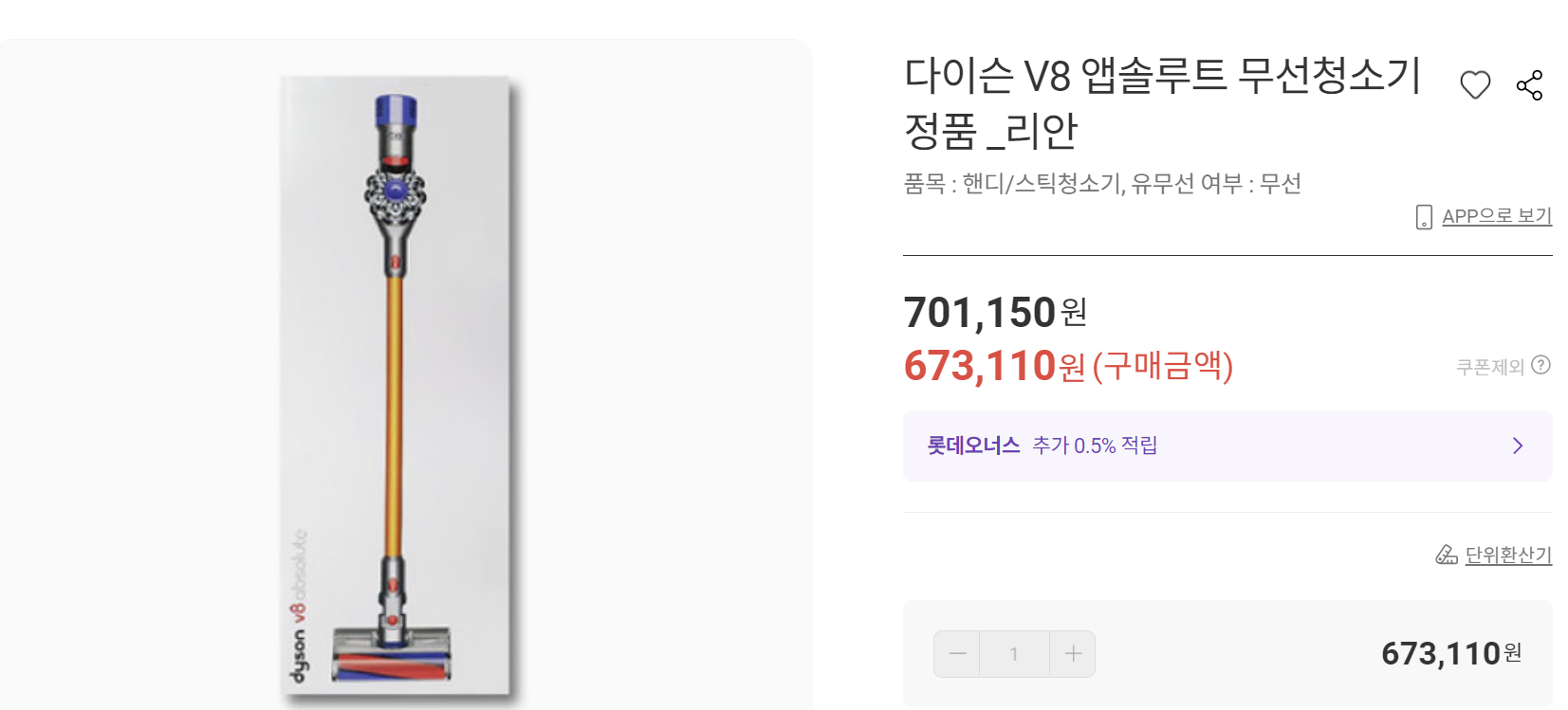 일단 제가 기존에 사용하고 있던 다이슨 v8 버전인데 아직도 인터넷에서 60만 원대 정도로 판매 중이네요. 다이슨이 좋은 이유가 그래도 가격 방어가 잘돼요. 이게 왜 장점인지는 모르겠으나(?) 그래도 가격방어가 잘 되니 나중에 혹시나 중고나 당근으로 팔기도 좋고 좀 덜 억울한 면이 있죠. 하하