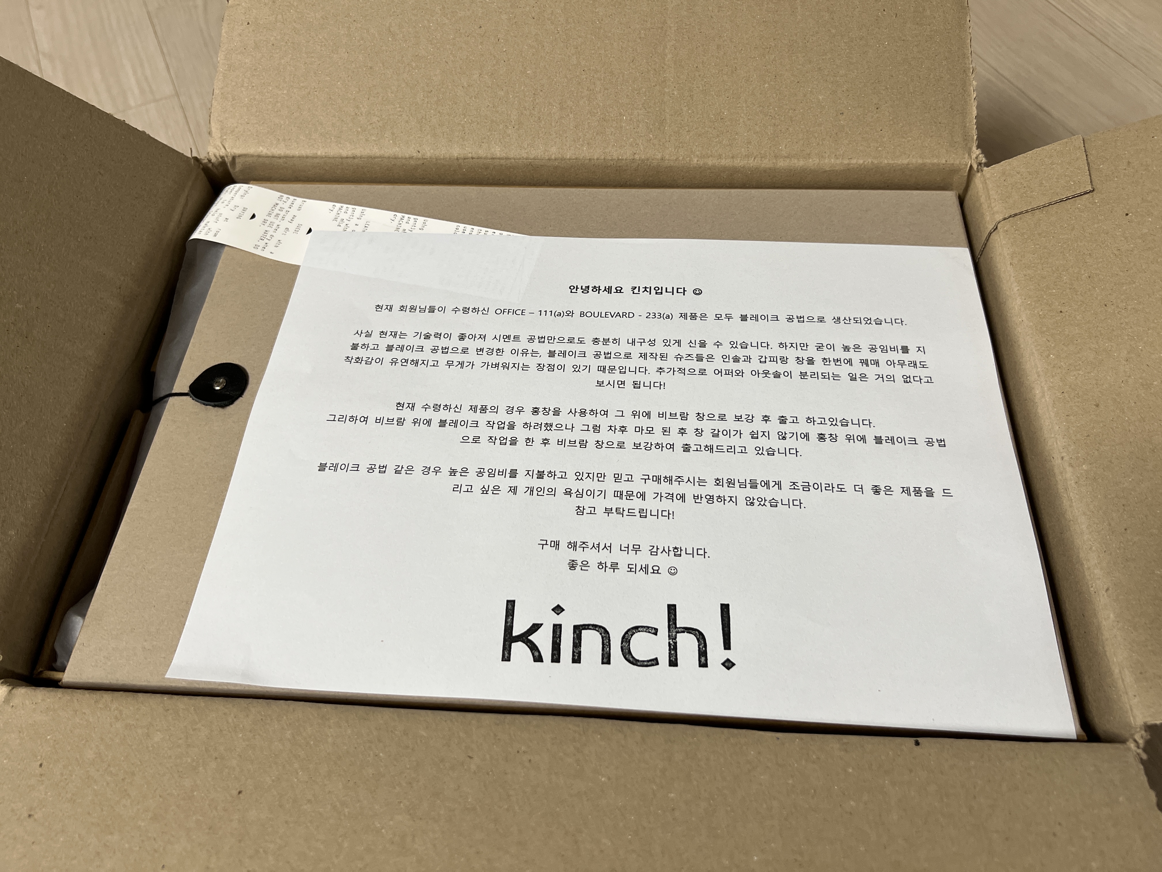택배박스를 개봉하니까 먼저 보이는 안내문입니다. 원래 홍창이나 비브람창으로 보강 후 출고하고 있다고 하는데요. 홍창 그 자체도 좋긴 한데, 비브람솔로 되어 있으니 더욱 내구성과 착화감이 상승하겠죠.