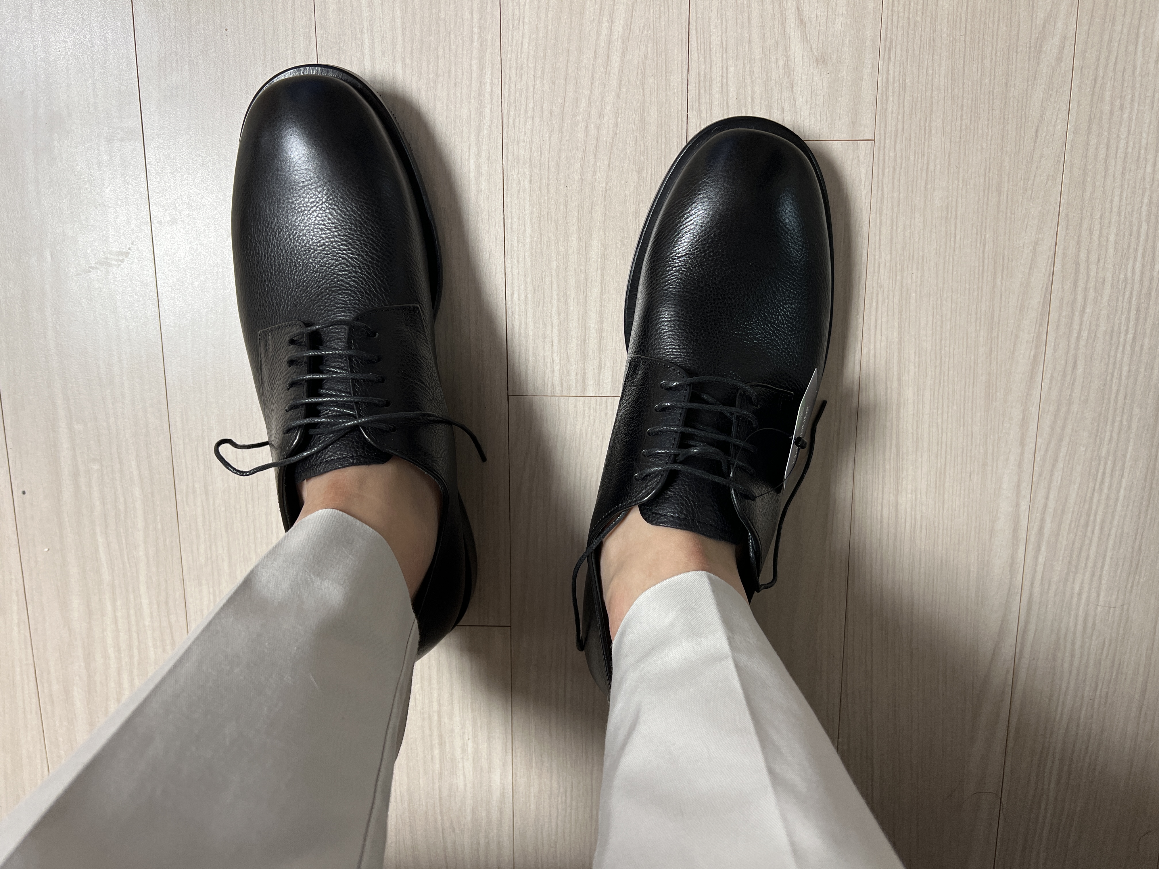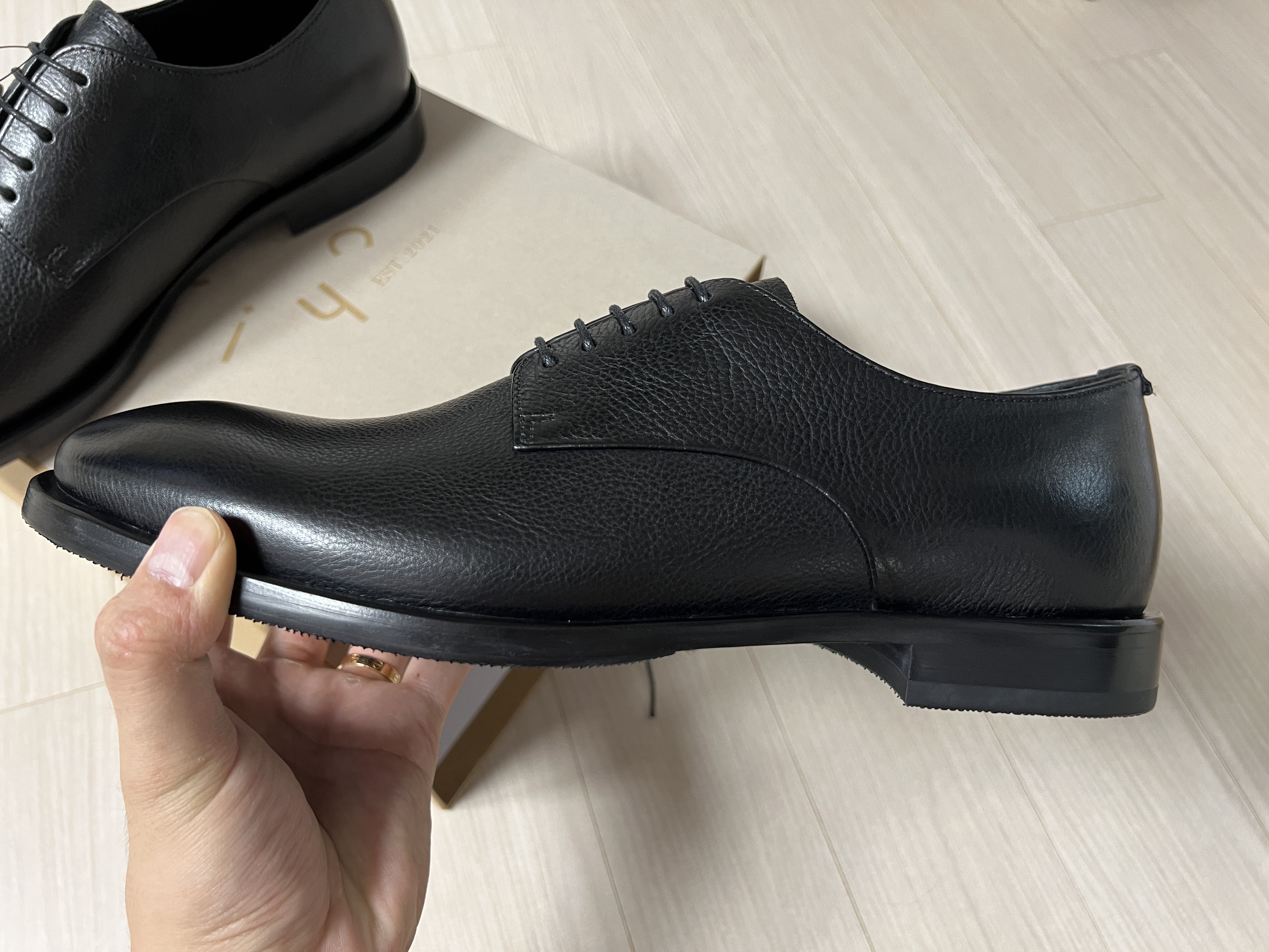 특히, 옆태가 정말 섹시하다고 볼 수 있어요. 개인적으로 짜리몽땅한 더비슈즈를 정말정말 싫어하는데, 이건 길쭉한 쉐입이 왕발 크리가 날 순 있어도, 요즘 트렌디한 밑단 넓은 바지와도 아주 잘 맞고 슬랙스, 포멀한 수트와도 엄청 잘 어울린다고 생각해요.