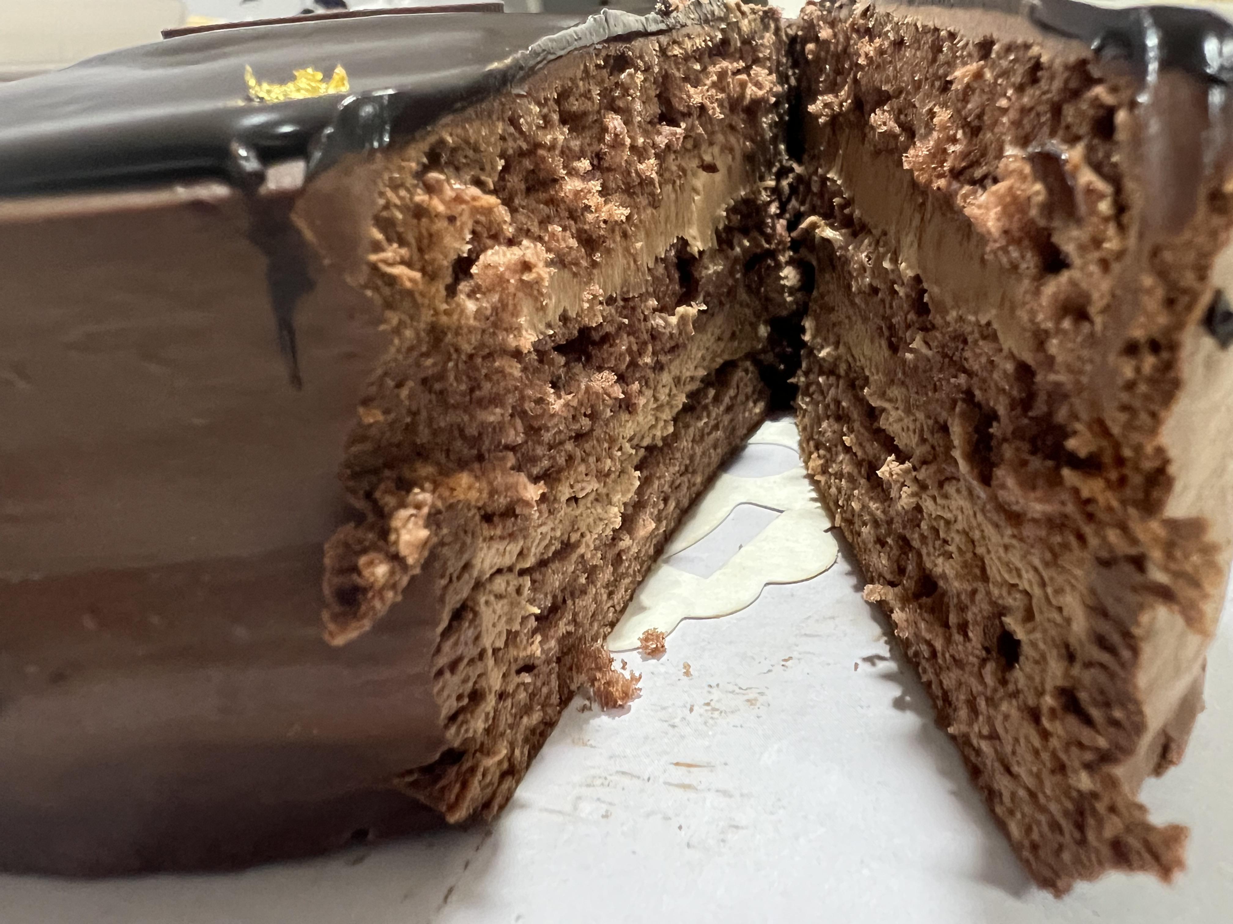 가까이서 보면 진한 초코 위에 금가루가 살살 뿌려져 있어 매우 먹음직스럽게 보여요. 별다른 데코 없이 심플하지만 그래서 더 고급스러워 보입니다.