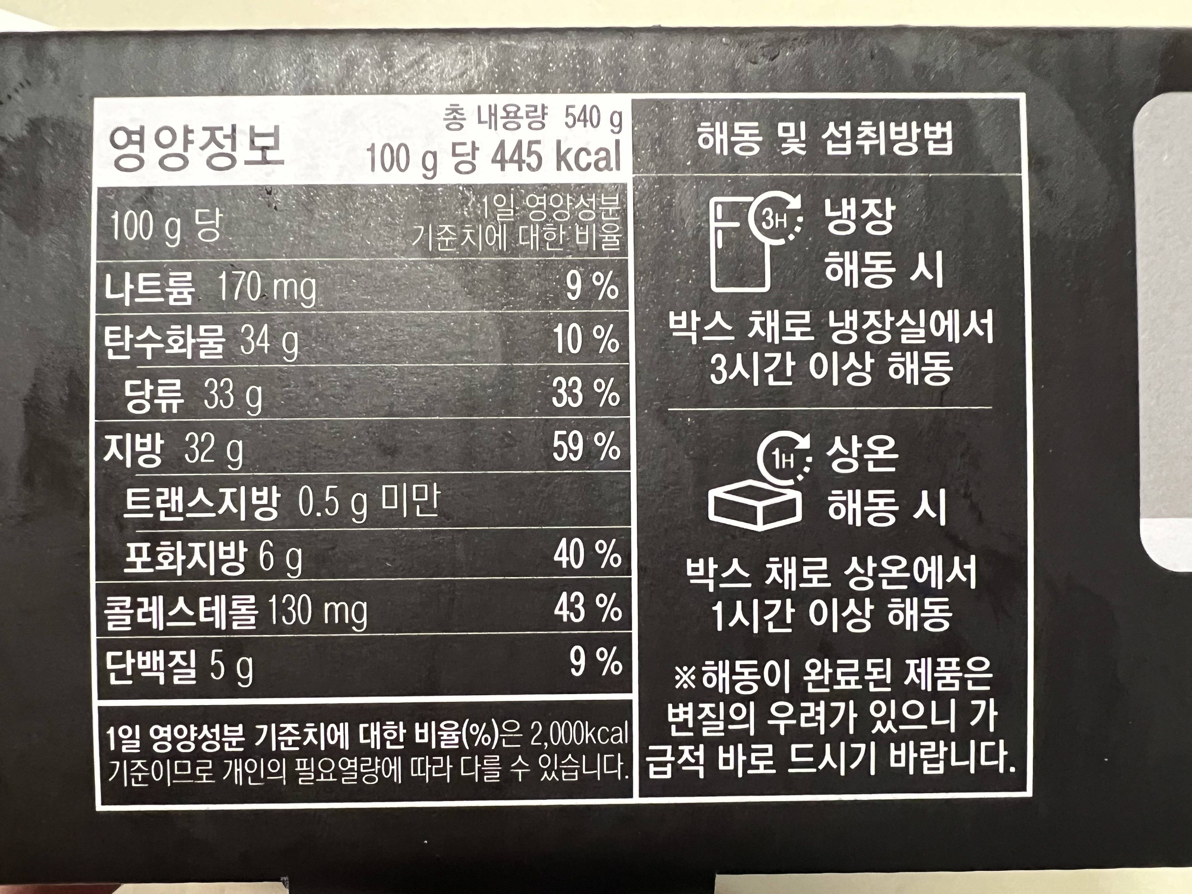 다크초콜릿 케이크이지만 밀크초콜릿과 다크초콜릿이 함께 섞여있네요. 칼로리는 보시다시피 어마어마하고 -18도 이하의 냉동보관을 하라고 하네요.