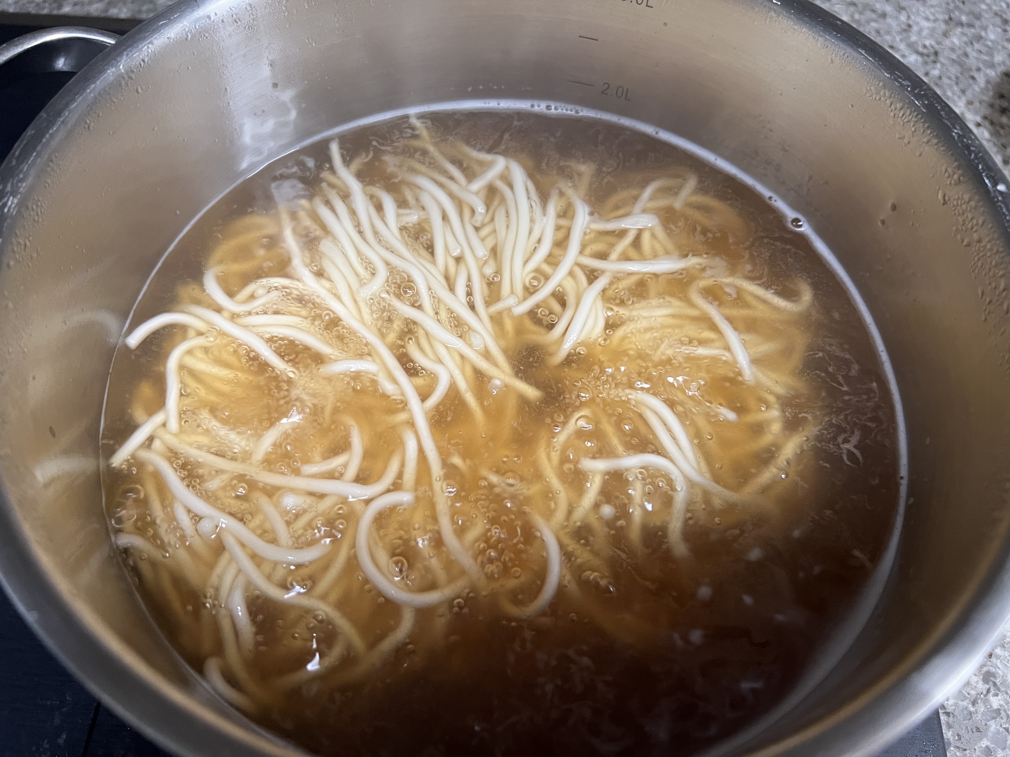 2. 팔팔 끓인 육수에 칼국수 면을 넣고 4분 30초에서 5분 가량 중불에서 끓인다.