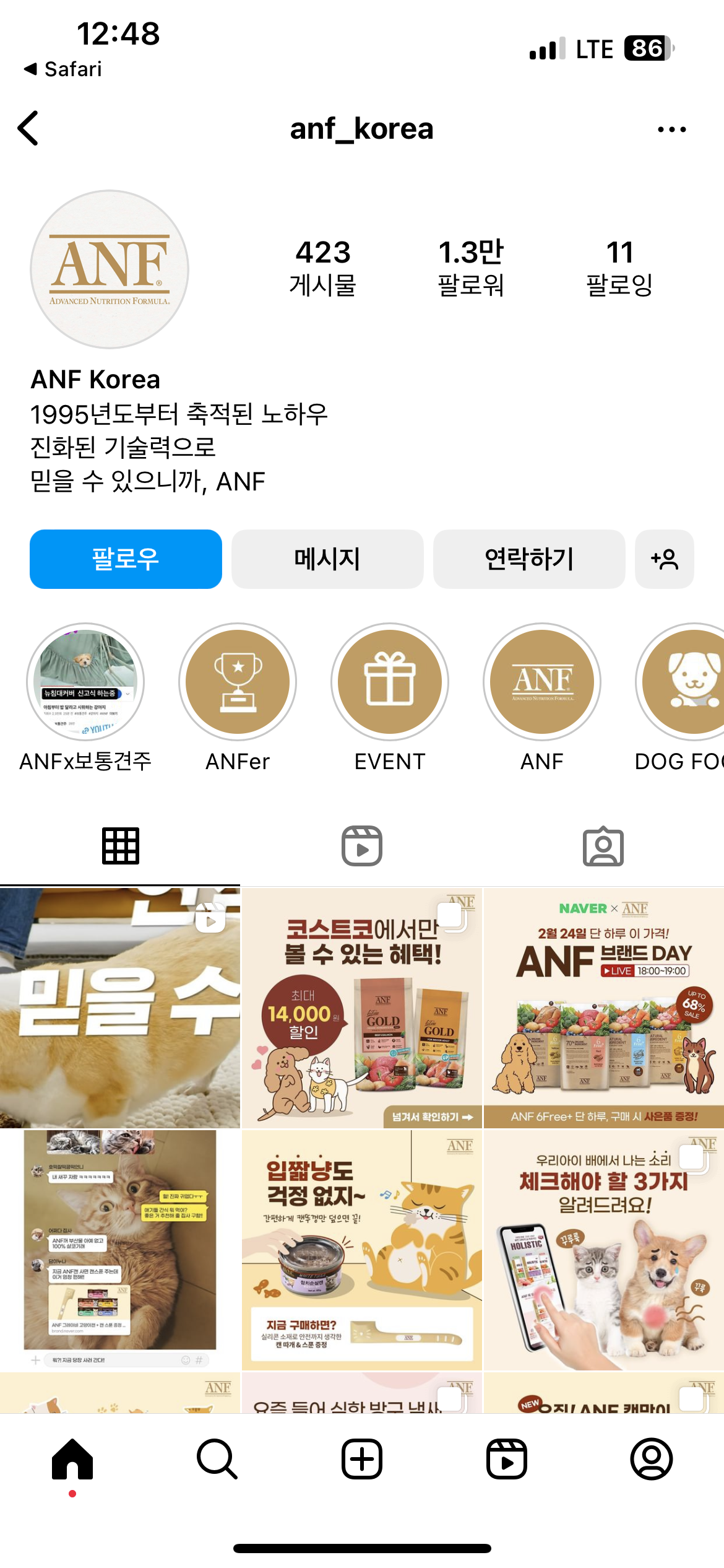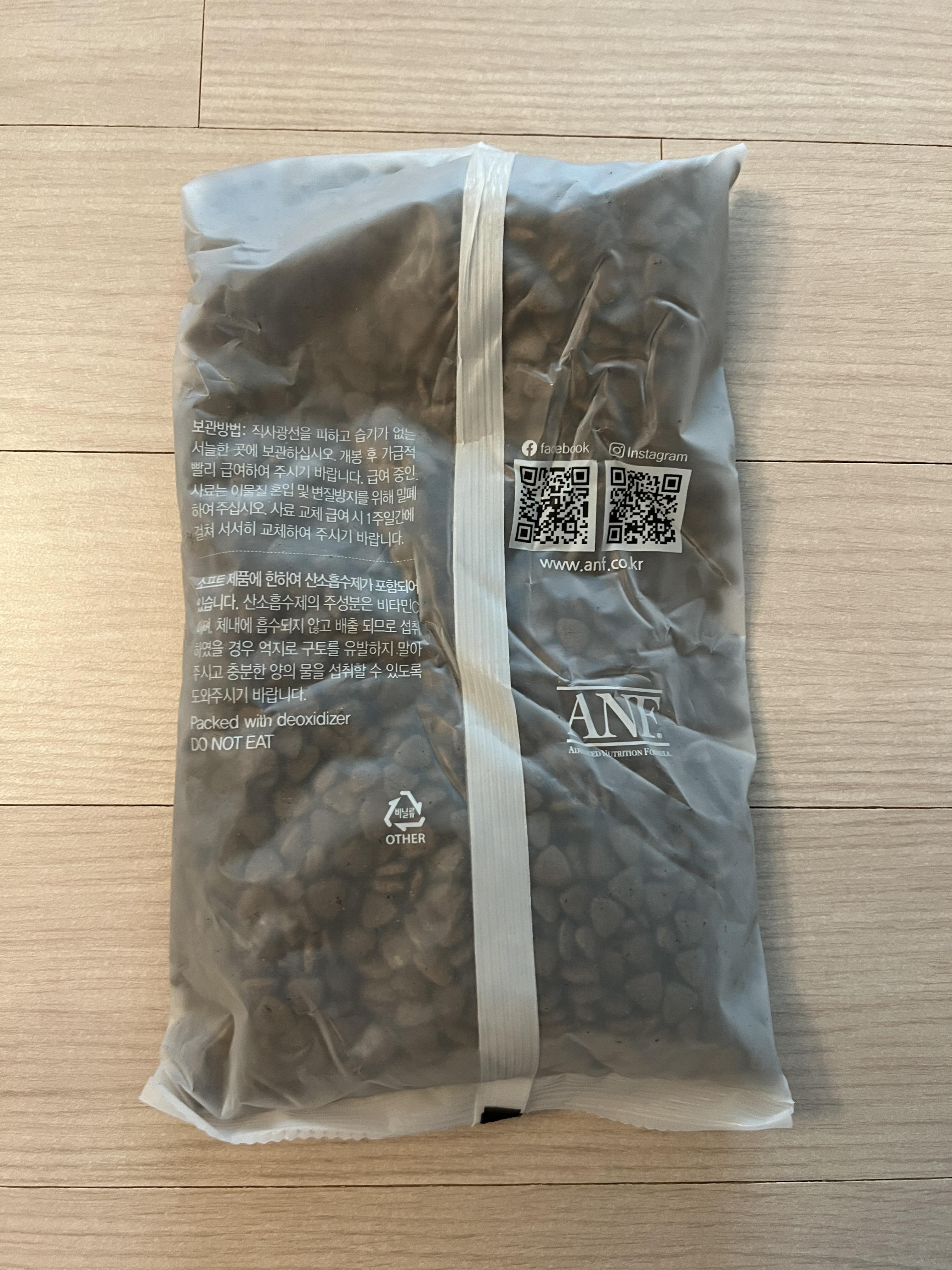 포장지에 QR코드가 있어서 호기심 삼아 눌러봤더니, 저렇게 회사 공식 SNS 계정이 연결되어 있더라구요. 사료 이벤트를 주로 알려주는 것 같은데, 이 회사의 사료를 장기적으로 꾸준히 구입하실 분들은 팔로우하셔서 할인 이벤트 등의 정보를 얻는 것이 좋아보입니다.