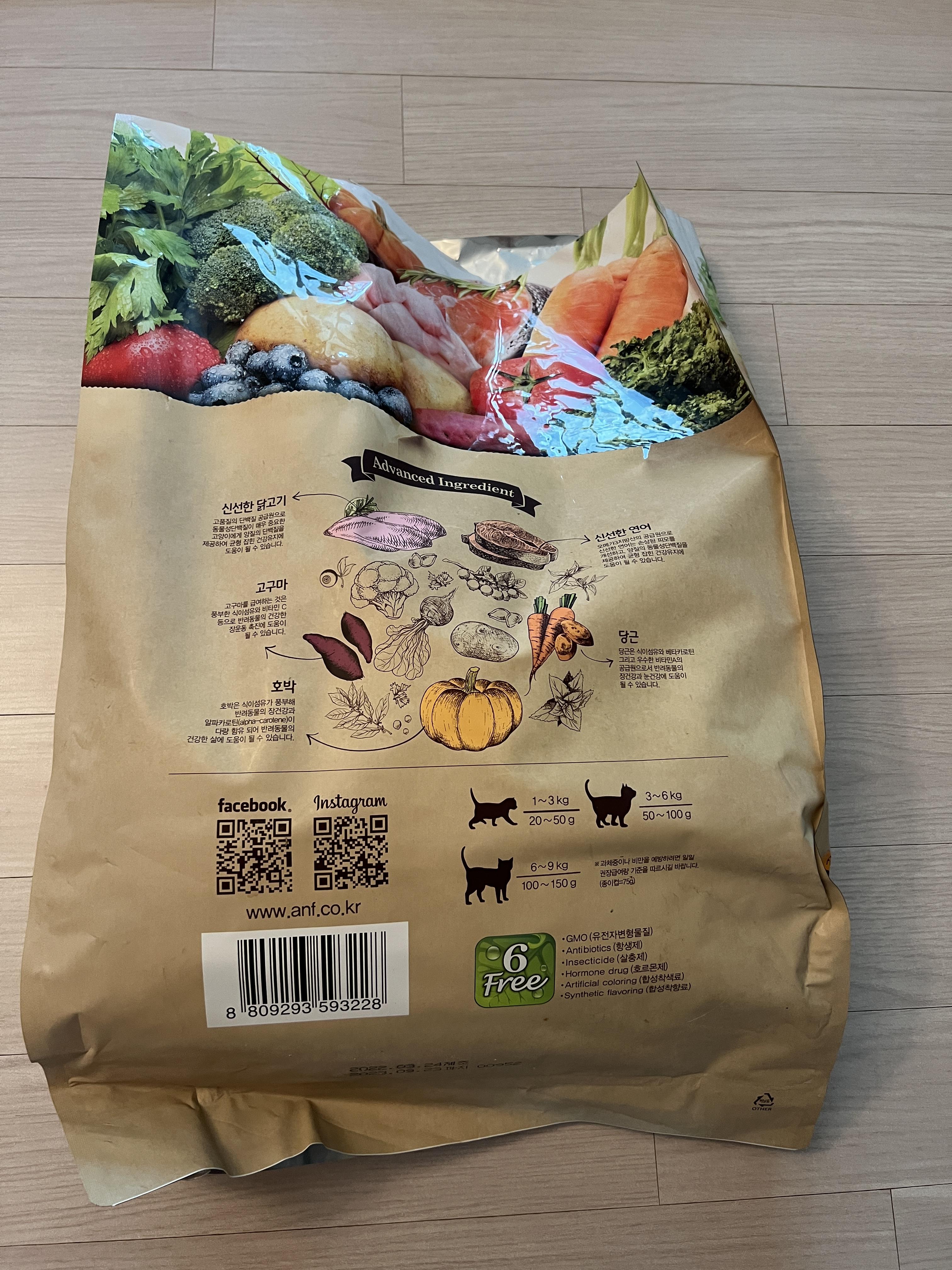 사실 후기 남길 생각이 없던 제품이라 언박싱할 때 바로 찍은 사진이 아니라서 양해 부탁드려요 ㅠㅠ 그만큼 써보다가 마음에 든 것이니 정말 보증할 수 있는 사료입니다. ANF 식스플러스 플러스 캣 인도어 어덜트 고양이사료는 생후 12개월 이상 먹는 것을 권하고 있습니다. 실내 반려묘의 건강을 고려한 균형 잡힌 영양식단이라고 포장지 전면에 소개할 만큼, 사료의 성분이 좋습니다.