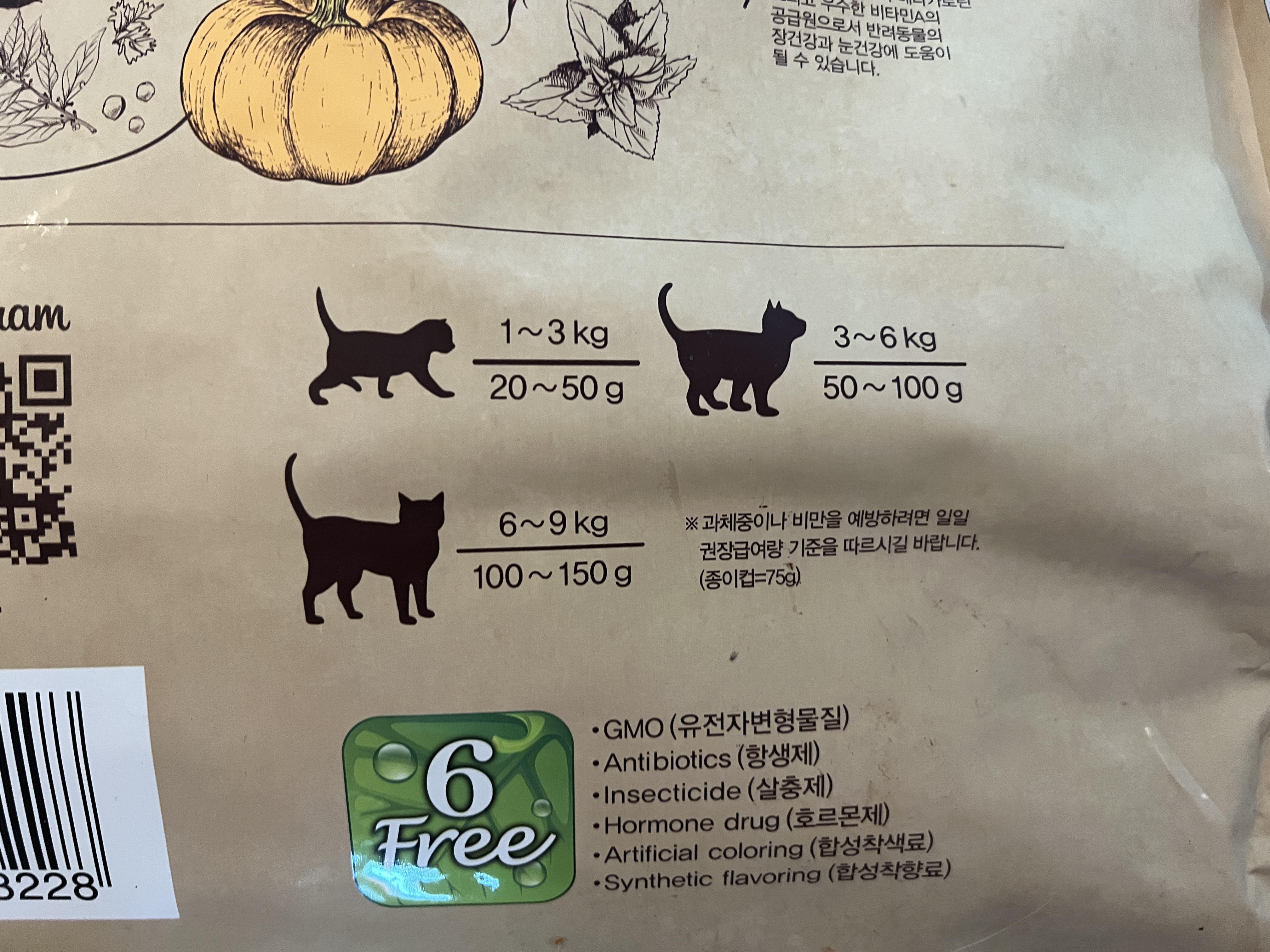 이렇게 성분도 중요하긴 하지만 저에게 사료를 고를 때, 첫 번째는 기호성 그 다음이 성분이라고 생각해요. 제 고양이는 4살이고 5KG 조금 넘는데요. 약 50~100G 정도의 권장량만큼 사료를 주고 있는데, 한 번에 1/3 정도는 먹더라고요. 조금씩 나눠서 먹는 고양이 특성을 고려하면 잘 먹는다고 볼 수 있어요. 여하튼 친절하게도 사료 뒷면에 고양이 체중에 맞게 적정량의 사료 급여량을 적어놔서 집사 입장에서는 정말 편리하다고 볼 수 있어요. 외국 사료의 경우에 온통 영어로 되어 있기도 하고 사실 포장지가 허접하잖아요 ㅠㅠ 국산이 역시 최고입니다.