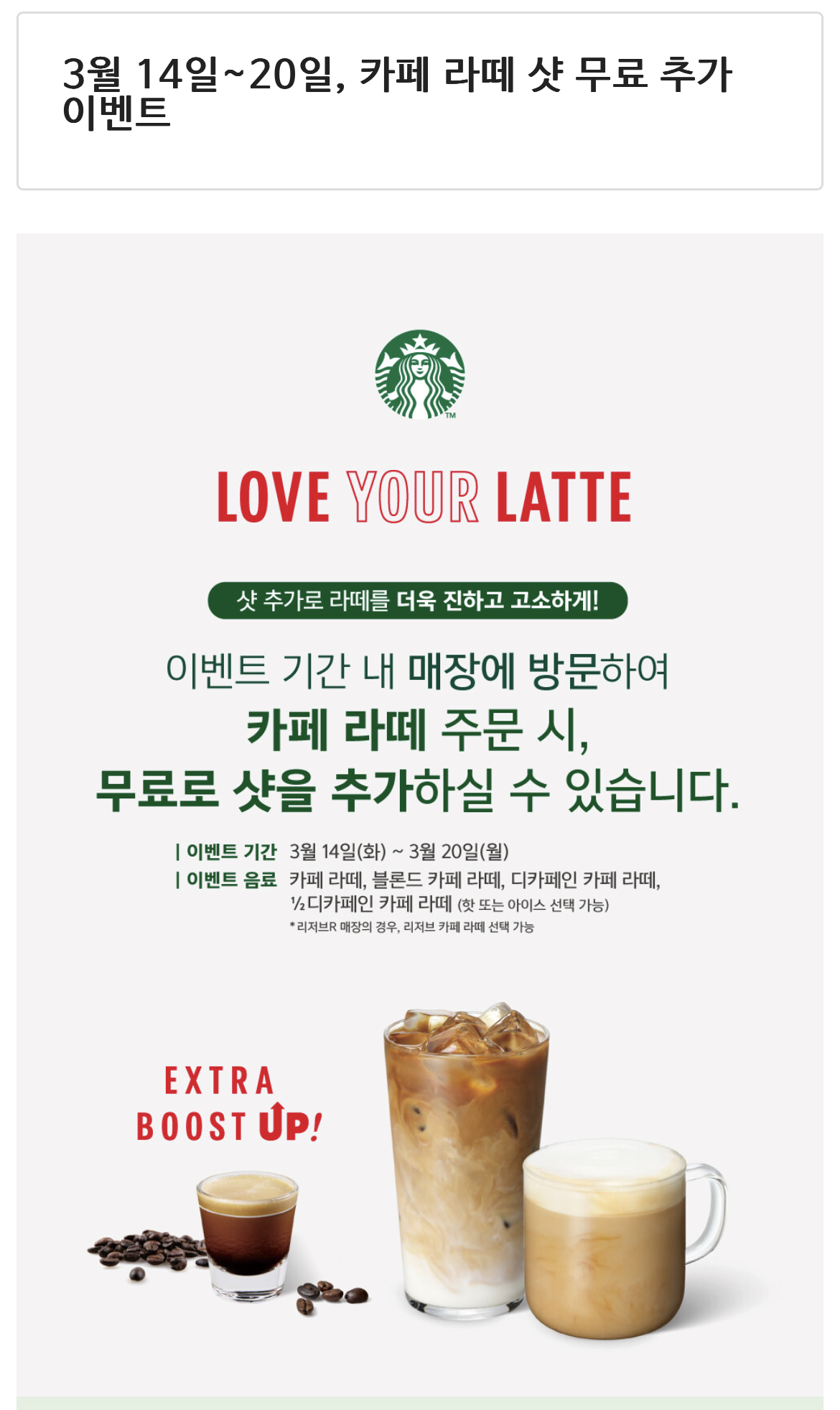 2023. 3. 14.(화)~3. 20.(월) 7일간 카페라떼, 블론드 카페라떼, 디카페인 카페라떼, 1/2 디카페인 카페라떼 (핫 또는 아이스 선택 가능) 주문 시 무료로 샷을 추가해주는 이벤트를 진행합니다. 리저브 지점의 경우, 리저브용 카페라떼에도 해당 이벤트 적용이 가능합니다.