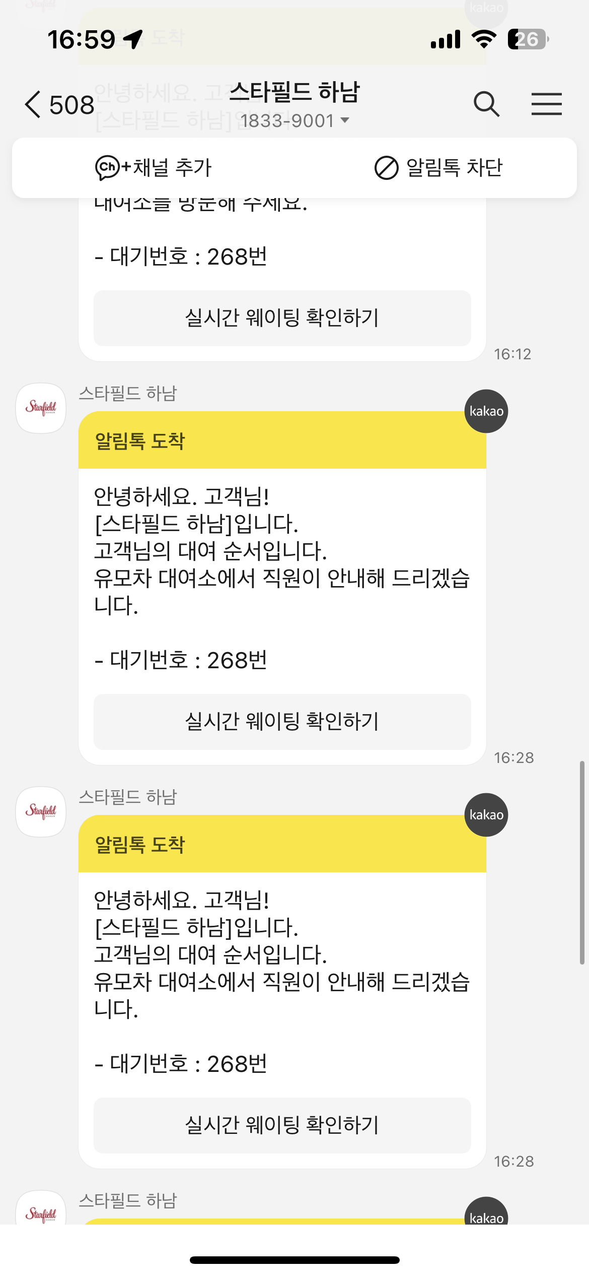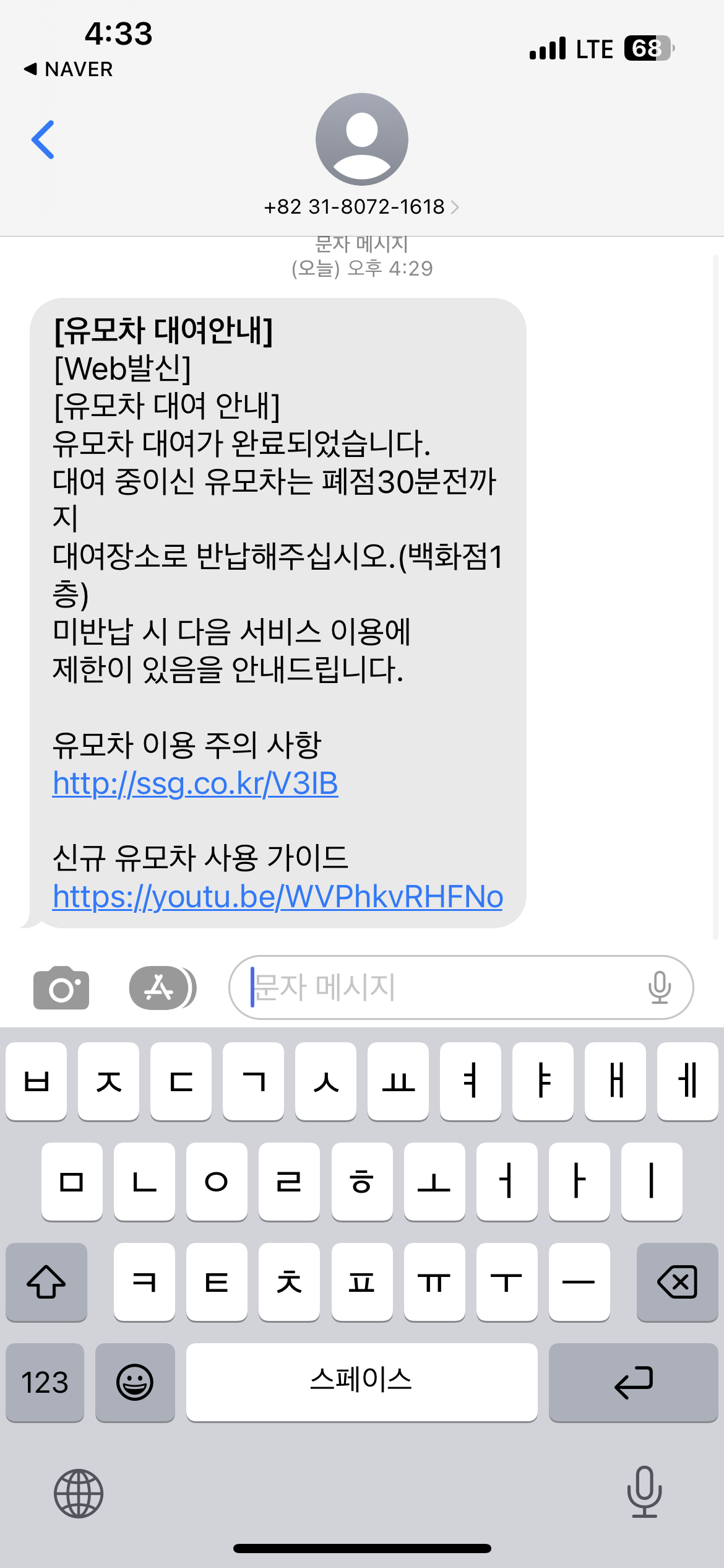 200번 대기인원이 넘어가던 스타필드쪽 유모차와 달리, 신세계백화점 쪽은 바로 대여가 가능했어요. 휴대폰번호 입력하면 이렇게 문자가 오고 대여시간 안내가 옵니다. 대신, 백화점 유모차이기 때문에 늦어도 저녁 8시 30분까지는 반납해야 합니다.(주말기준)