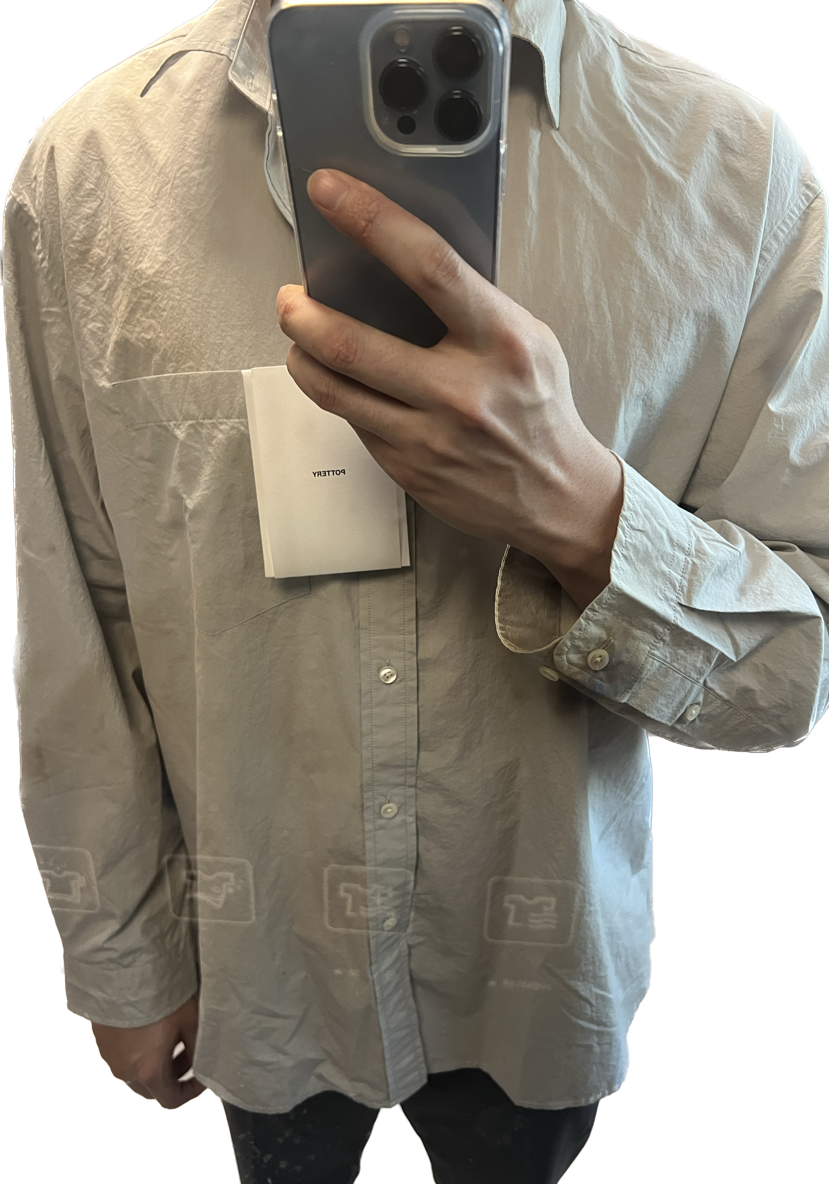 참고로 thin 버전 2 사이즈는 182 / 80 인 체형이 입었을 때 이 정도 느낌이 나옵니다. 상체는 평균 수준이고 어깨가 하견형입니다. 포터리에서 의도한 핏을 내려면 3 사이즈로 가야 하나, 입은 사람이 어깨드랍이 심한 셔츠를 싫어해서 다운 사이징을 했다고 하네요. 2 사이즈는 한국 사이즈로 105 입는 사람이 약간 넉넉하게 맞고, 3 사이즈는 아주 널널이 맞는다고 됩니다. 포터리 1은 95~100, 2는 100~105, 3은 105~110 정도로 생각하시면 되는데, 앞서 말씀드렸듯이 제품마다 사이즈 편차가 커서 반드시 피팅해보고 결정하시는 것을 추천드려요.