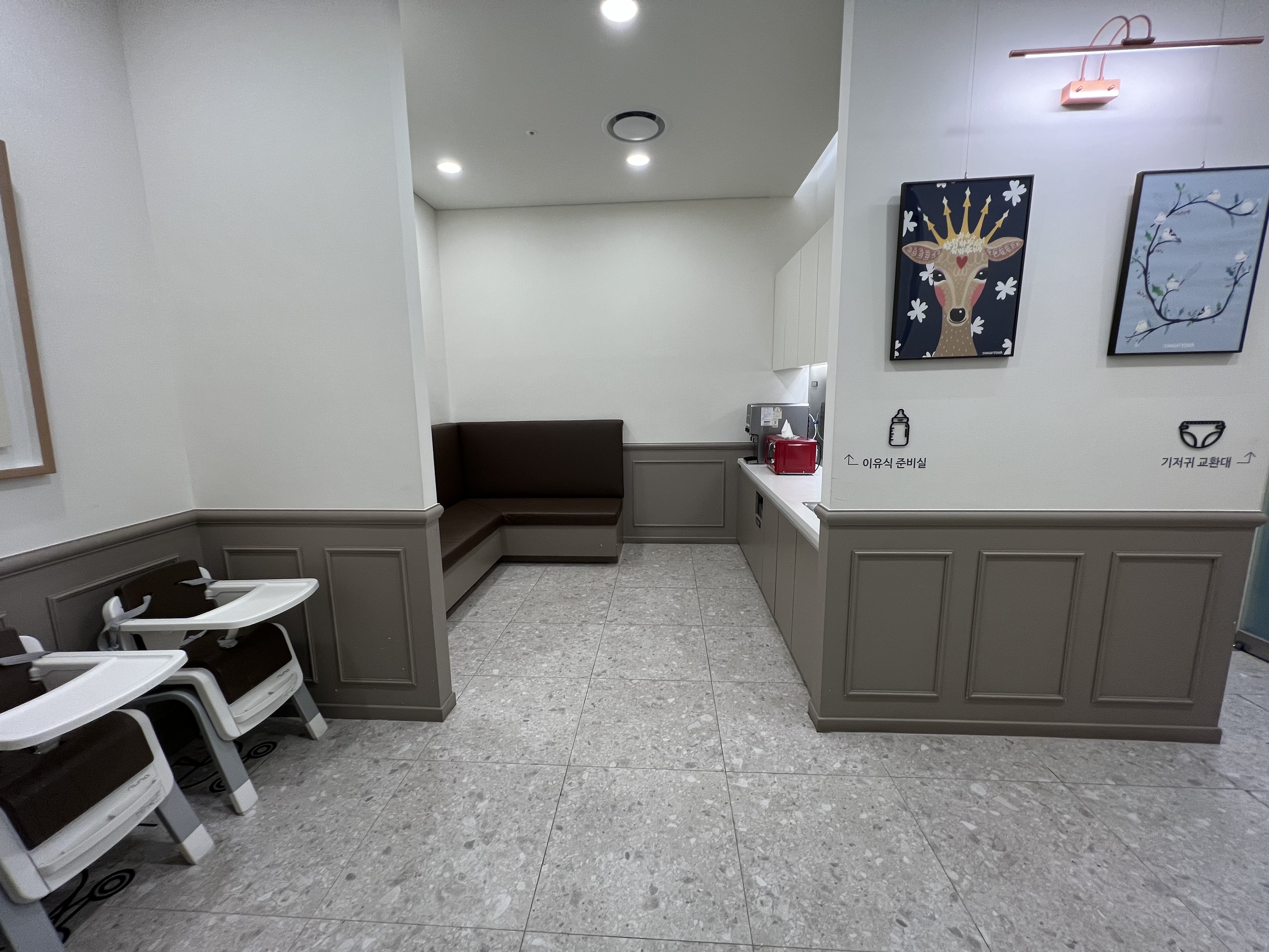 베이비라운지 입구에 들어서면 이렇게 이유식공간과 기저귀교환대 공간으로 나뉘어 있어요. 수유실은 기저귀교환대쪽에 위치해 있어서 기저귀교환대 쪽으로 가시면 됩니다.