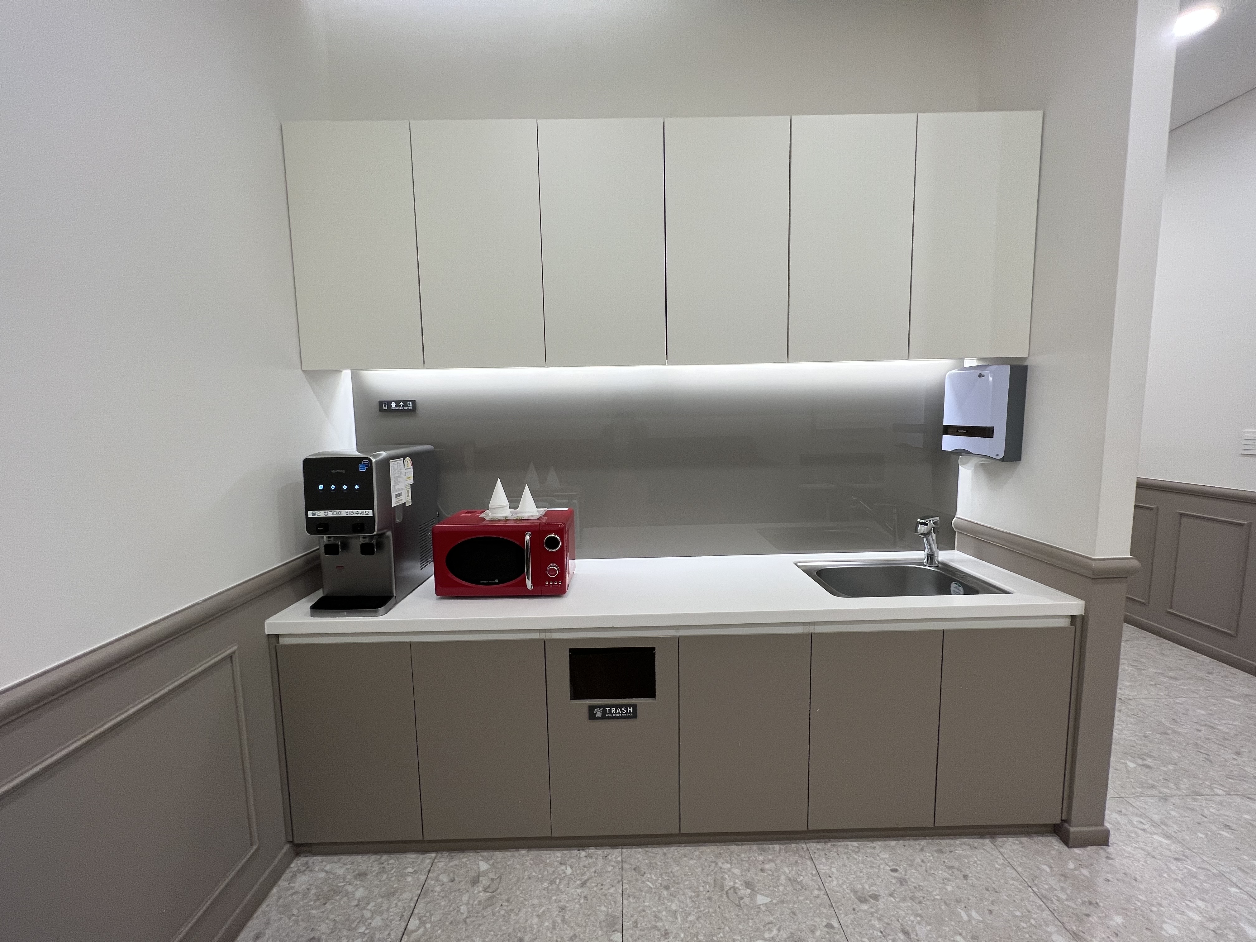 이유식 준비공간에는 정수기와 전자레인지, 세면대가 준비되어 있어요. 젖병세척도구나 젖병살균기 등은 비치되어 있지 않으니 이용에 참고해 주세요.