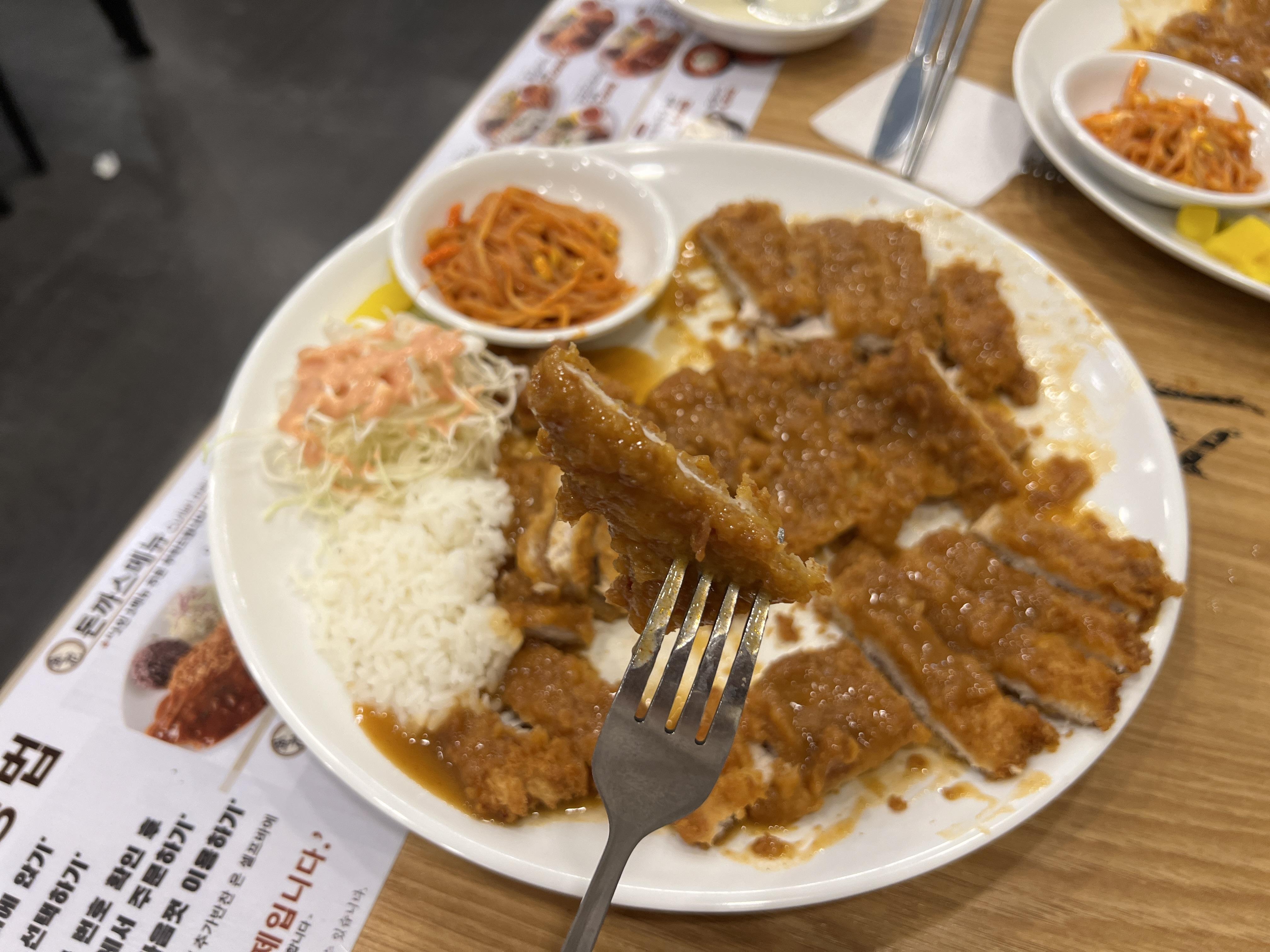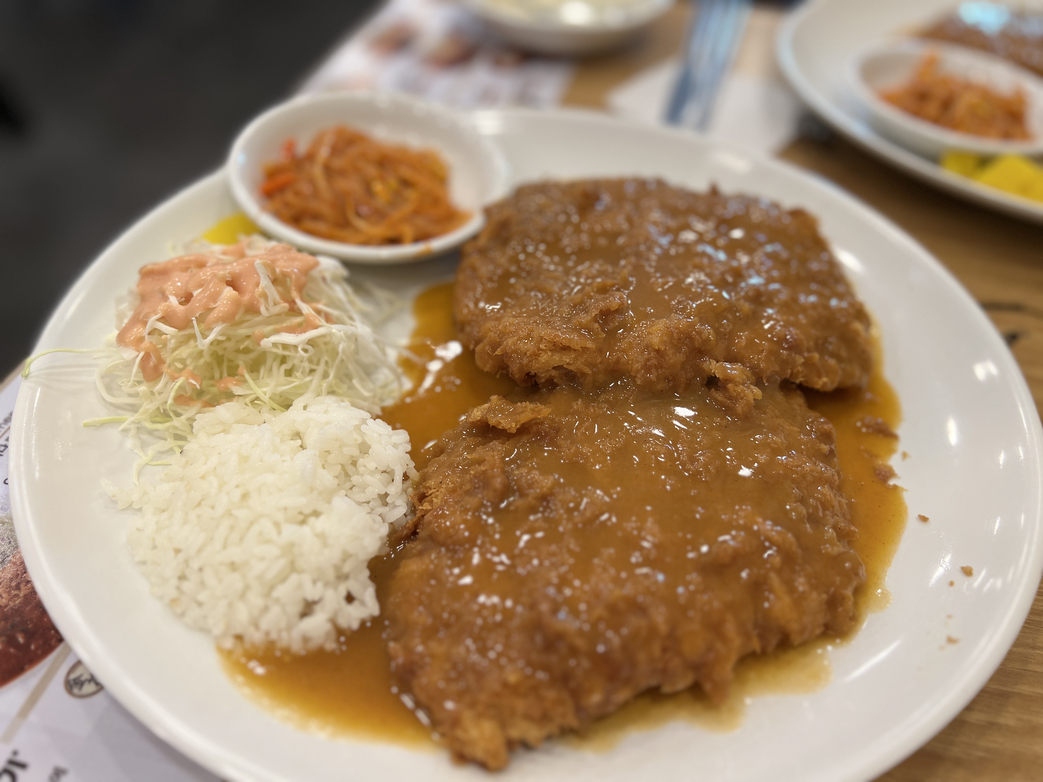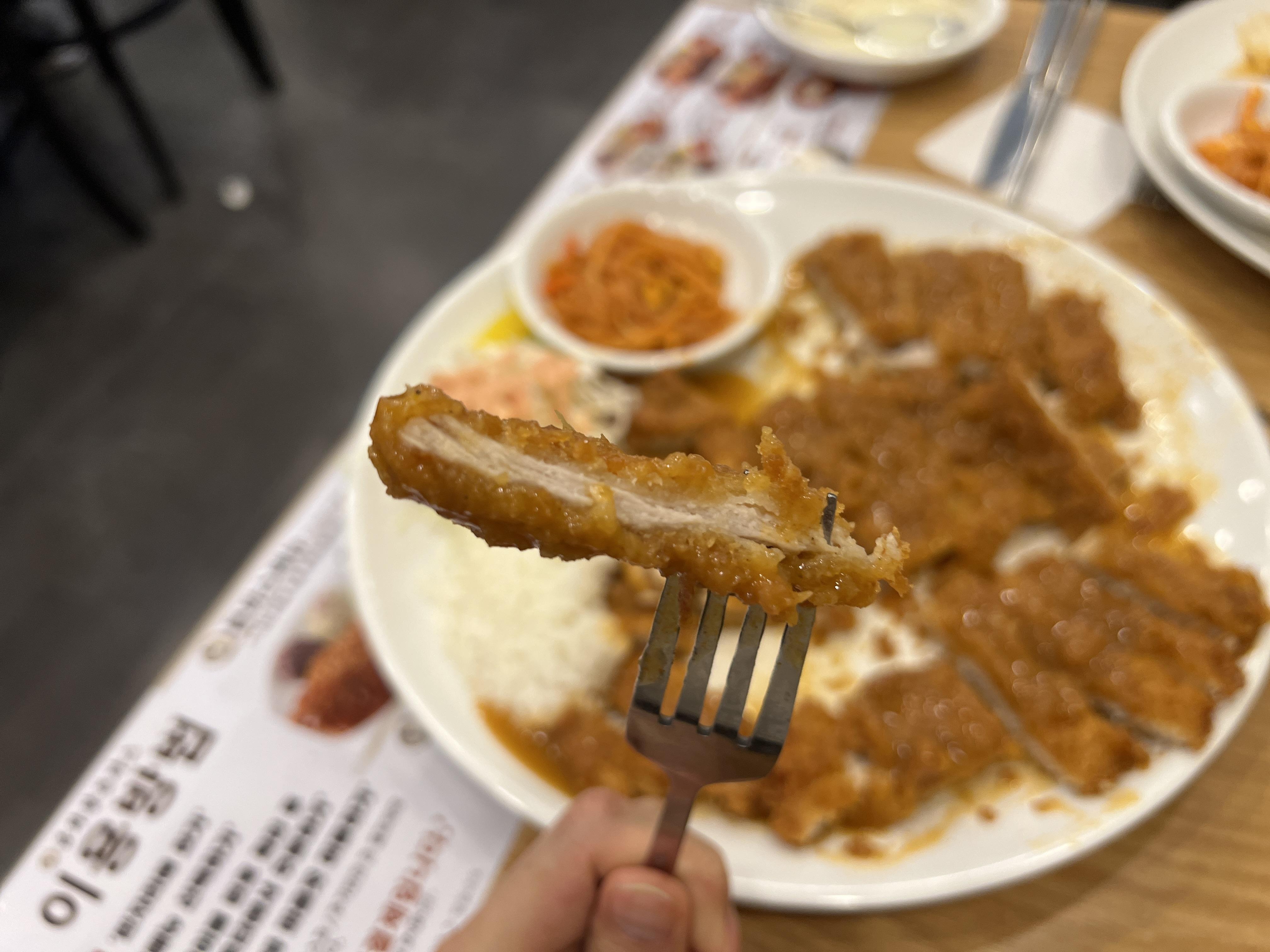 돈까스 단면입니다. 평범한 경양식 돈까스 두께였고 맛은 달콤한 게 과거의 맛을 상기시킬 정도로 훌륭한 맛이었습니다. 다만, 소스 양이 조금 적었다는 게 아쉬웠어요. 저희 테이블만 그런 거 일 수도 있지만요 ㅠㅠ 돈까스 패티가 촉촉하게 소스에 젖어서, 다소 눅눅하게 먹는 게 포인트라고 생각하는데, 조금 소스양이 적었다 이게 조금 아쉬웠고요. 나머지는 만족스러운 식사였습니다. 이상으로 후기를 마치겠습니다. 감사합니다.