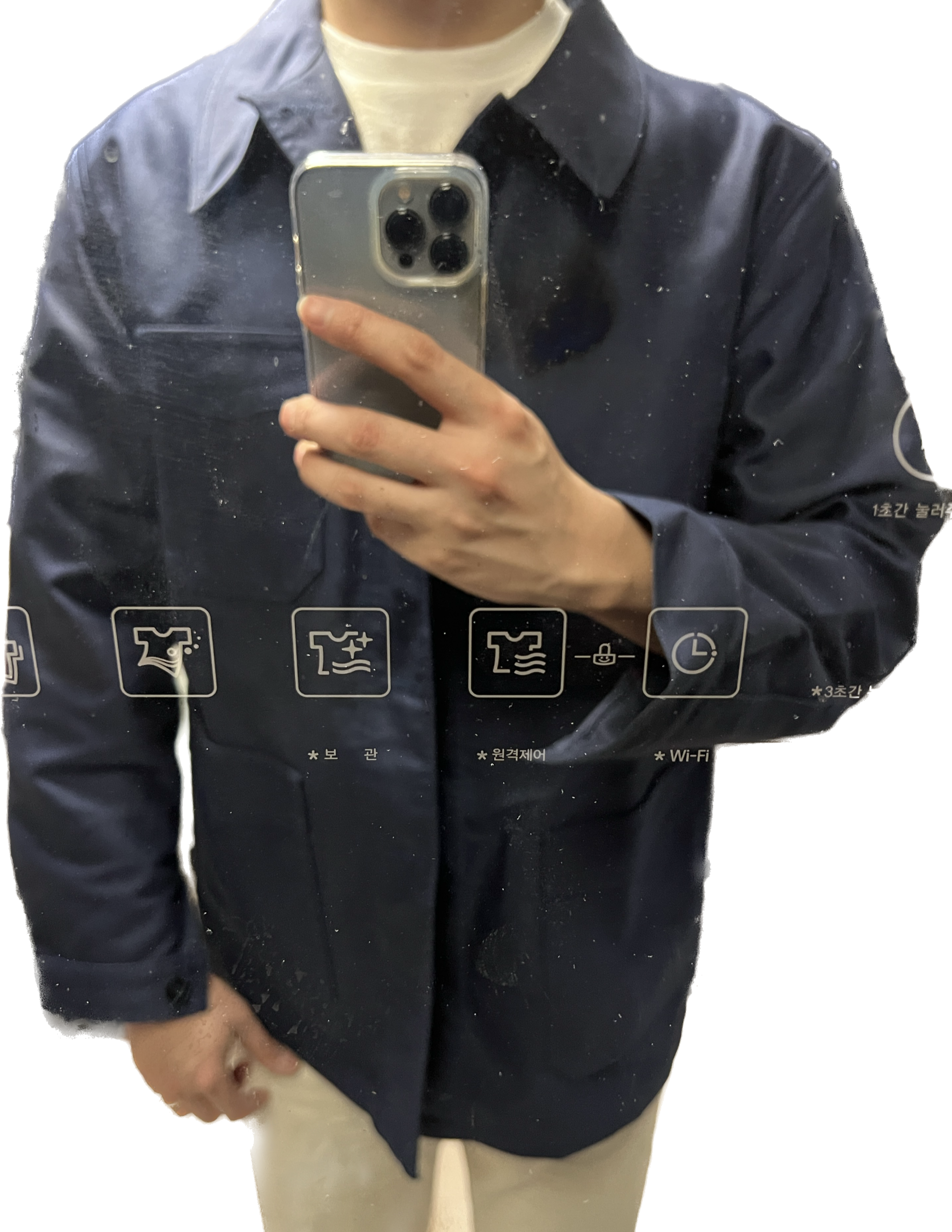 집에 전신 거울이 없어서 항상 옷방에 있는 에어드레서 앞에서 사진 찍는데요ㅠㅠ 양해 부탁드립니다. 사이즈감만 어느 정도 체감해 보시라고 참고샷으로 올려드려요. 182cm, 80kg 성인 남자 기준, 한국 사이즈 105~110 입는 사람으로서 5 사이즈 아주 약간 여유 있게 맞습니다. 두께감이 있는 니트류까지 이너로 커버가 가능할 것 같고요. 이상으로 후기 마치겠습니다. 감사합니다.