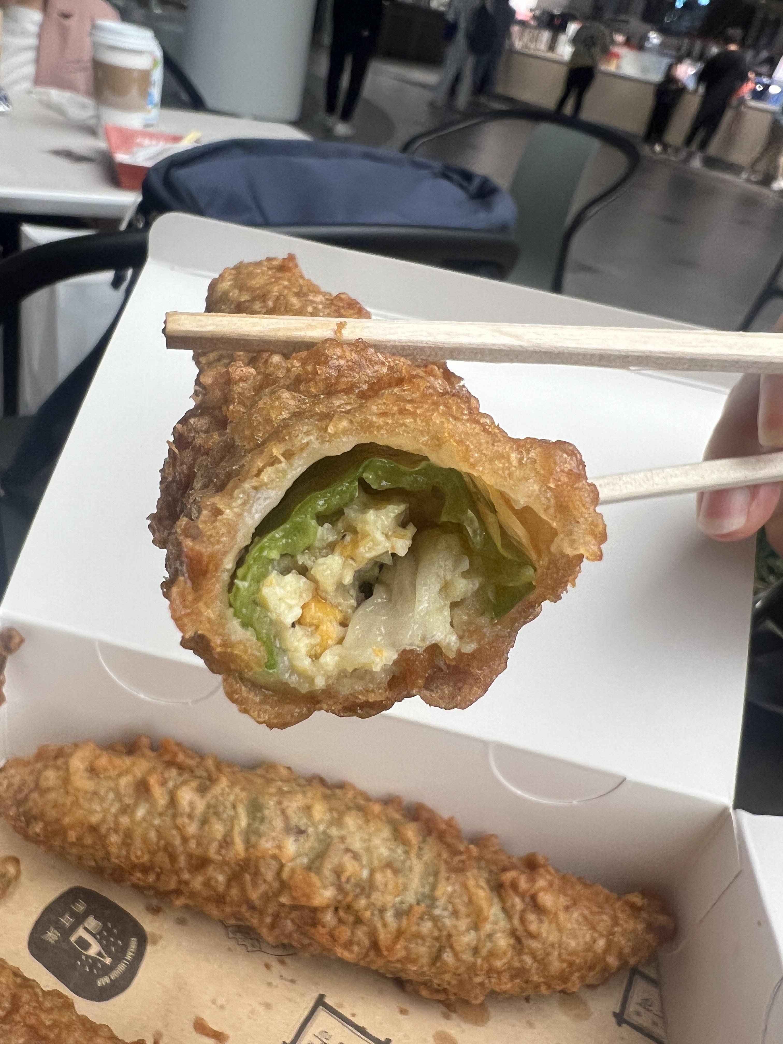 엄청나게 큰 고추에 가득 채운 소가 인상적입니다. 만두소 같이 고기와 야채로 채워져 있구요. 튀김은 바삭하고 안에는 부드러운 소가반겨주는데, 겉바속촉 그 자체입니다. 적당한 간이 되어 있지만, 특제 양파 간장소스를 찍어 먹으니 맛이 한층 배가 되더라구요. 진짜 먹는 내내 맛있다라고 감탄하면서 먹었습니다. 2인 이상 식사를 때우실 분들은 저거 가지고는 조금 부족하니까, 떡볶이 등 다른 메뉴와 같이 드시는 걸 추천드려요. 이상으로 후기 마치겠습니다. 감사합니다.