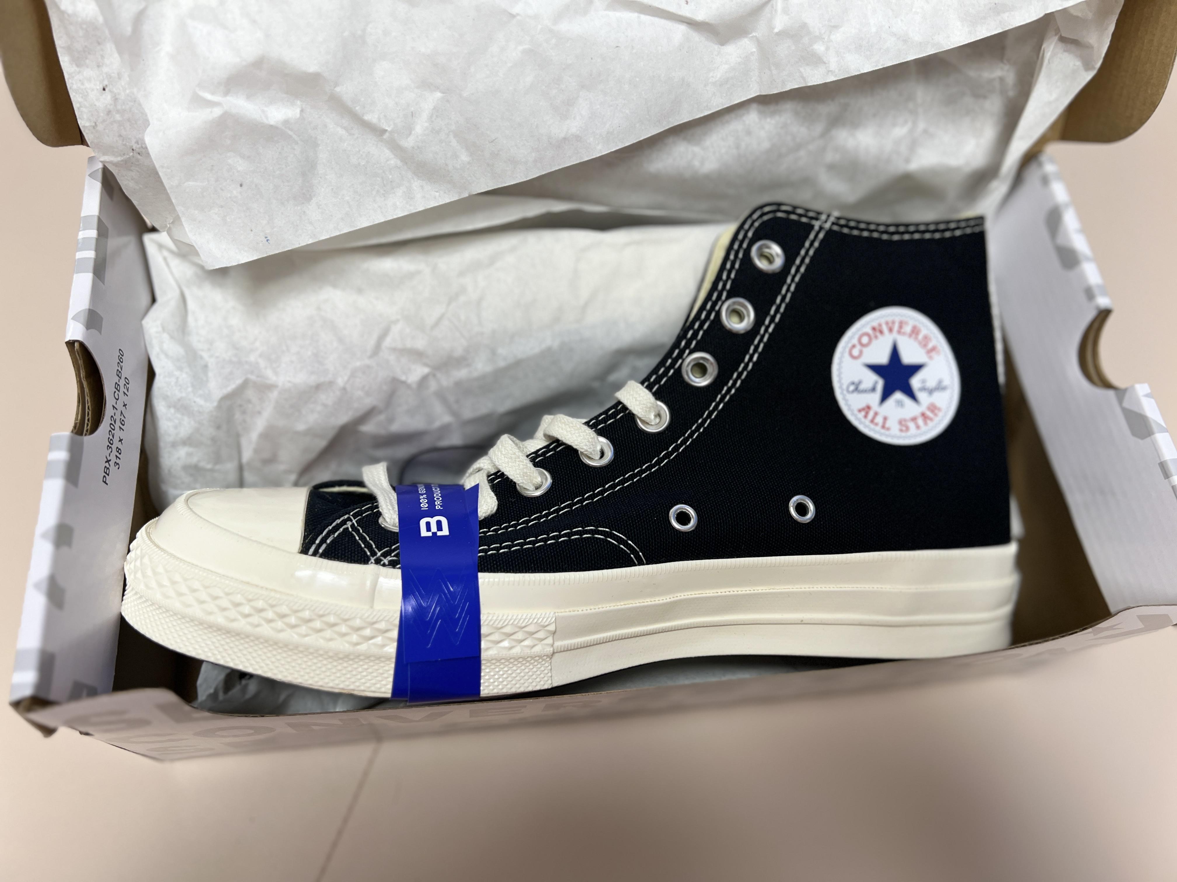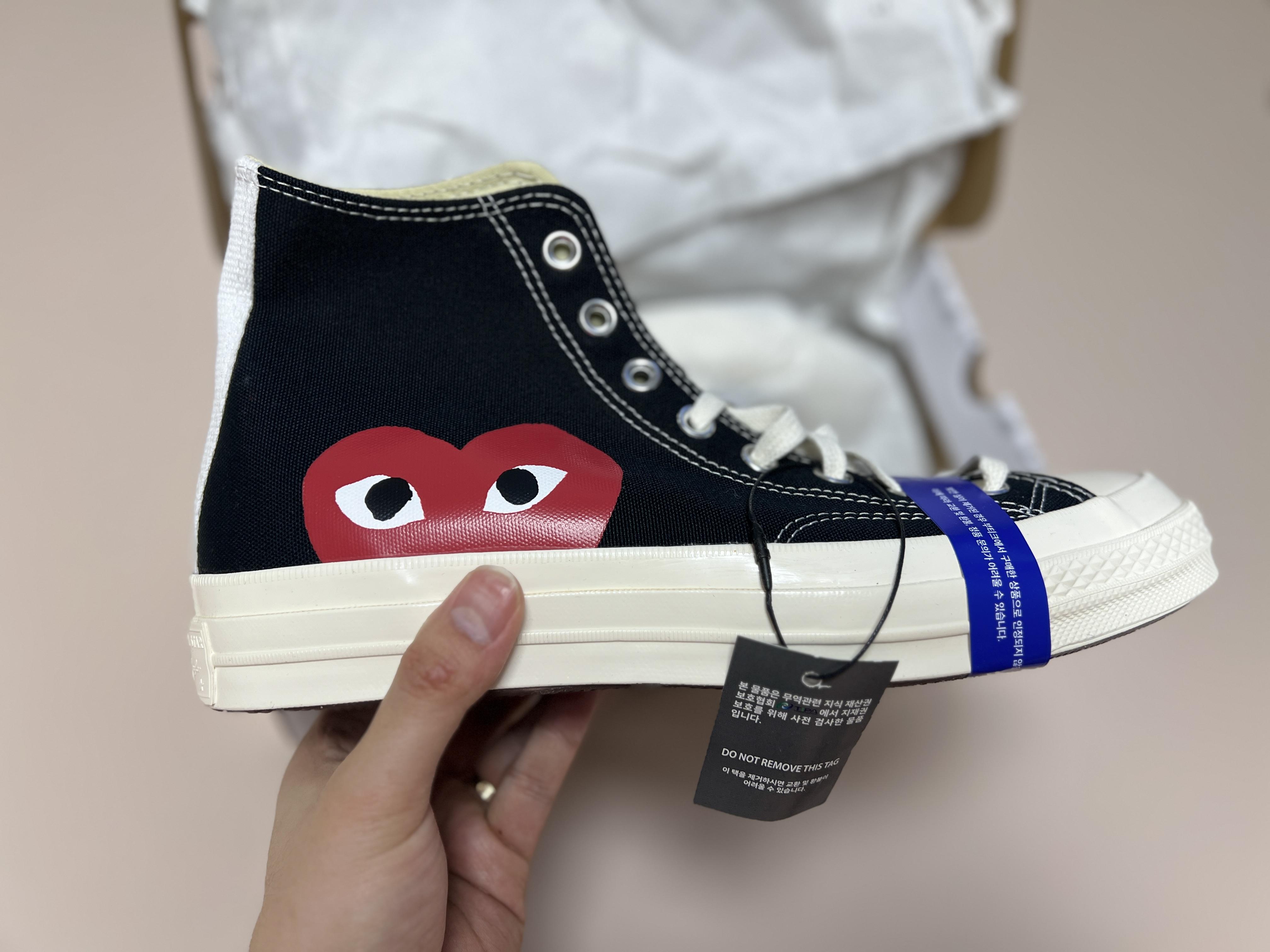 안녕하세요? 내돈내산 리뷰어 달꾸입니다. 이번에 소개해드릴 제품은 꼼데가르송 척70 하이 블랙입니다. 정식명칭은 Converse 척70 Red Heart Chuck 70 High Black이고요. ssf샵 기준으로 모델명은 MP31K3HG15, 무신사에서는 P1K1121FW22 품명으로 각각 판매 중입니다. 시즌이 달라서 품명이 다를 수도 있는 점 감안해 주시고요. 그냥 꼼데가르송 척70 하이 검색하시면 구매가 가능하십니다.