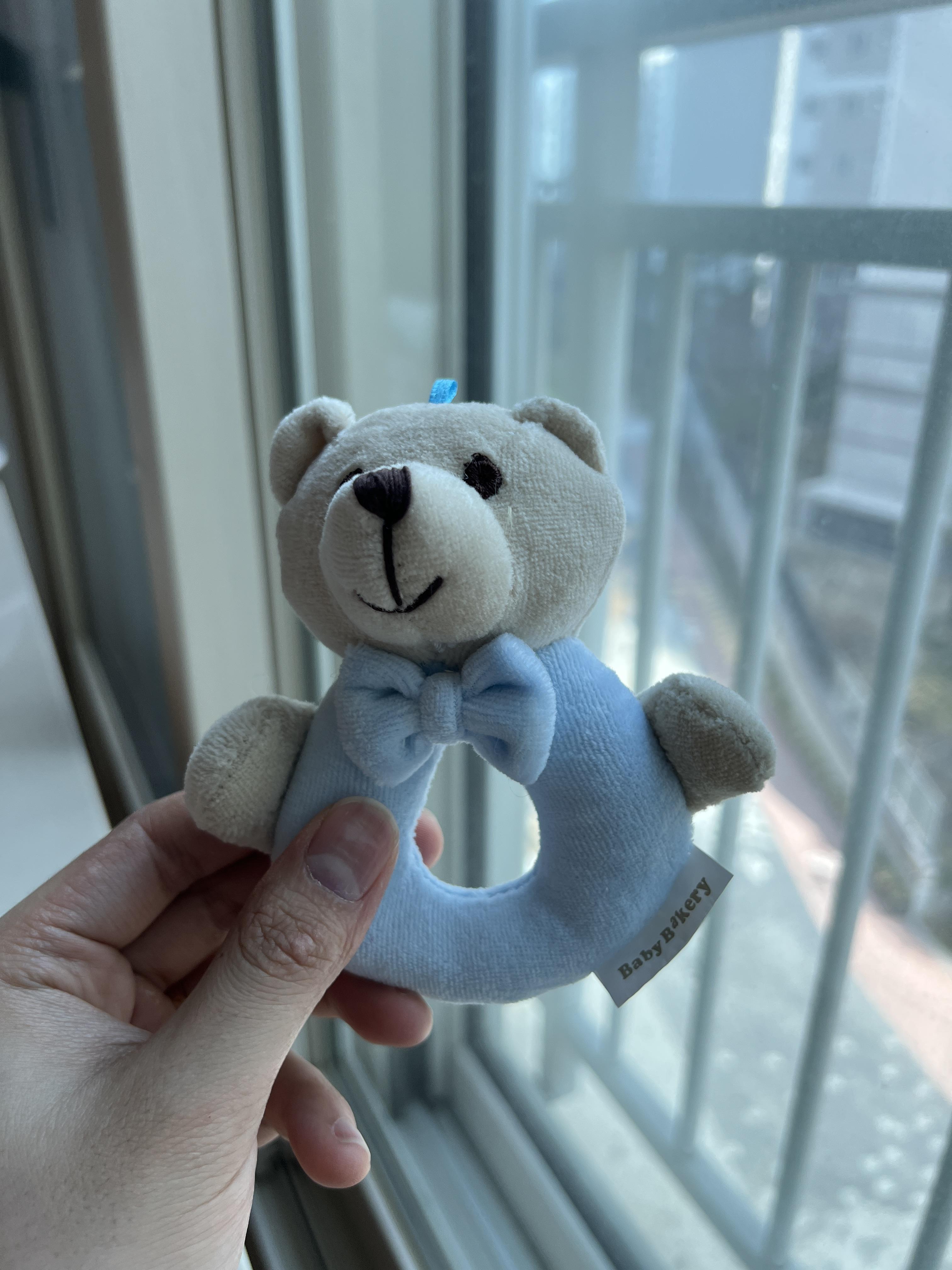 귀여운 곰돌이 인형입니다. 가운데 홈이 있어서 아기가 잡고 가지고 놀 수 있게 되어 있어요.