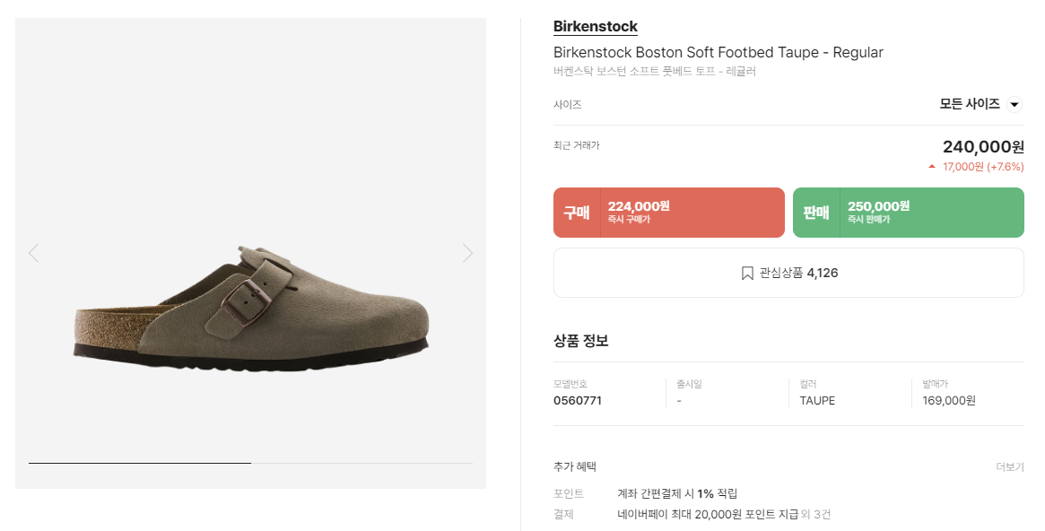 버켄스탁 보스턴은 현 시점에서 정가에 구매하기 조금 어려운 제품입니다. 해외 셀럽들이 많이 신으면서 역시나 대세를 탄 제품인지라, 크림과 같은 프리미엄 중개사이트에서 구매하셔야 됩니다 ㅠㅠ 정가가 많이 오른 편이라, 정가 대비 많이 비싼 편은 아니니까 접근해 볼 수 있는 가격대입니다. 그리고 휘뚜루마뚜루 신기 좋은 신발인 점은 분명하니까 투자 가치는 있다고 생각해요. 또한, 컬러는 토프, 타우페로 불려지는 TAUPE로 구매했고요. 이게 가장 인기가 많은 컬러입니다.