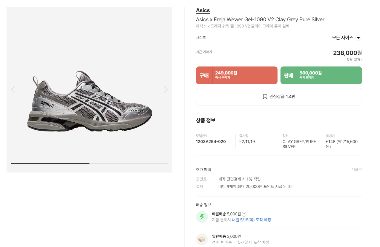발매한 지 꽤 되기도 했고 인기 모델 중 하나이기 때문에 정가로는 구매가 어렵습니다 ㅠㅠ 솔드아웃이라는 프리미엄 중개 사이트에서 구매했고, 20만 원 후반대에 구매했습니다. 남성분들이 즐겨 찾는 사이즈는 20만 원 중후반대부터 시작하고 여성사이즈는 4~50은 훌쩍 넘습니다. 아식스는 여성분들이 신어야 더 이쁜 건 있어요 ㅎㅎ