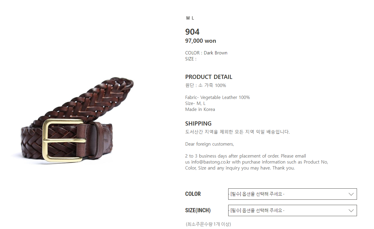 바스통 공홈에서 설명한 것을 인용하자면, 빈티지한 감도를 머금고 있는 황동 버클과 이탈리언 베지터블 레더로 제작된 웨빙벨트입니다. 또한, 기계적인 웨빙이 아닌 사람의 손으로 직접 웨빙했다고 합니다.