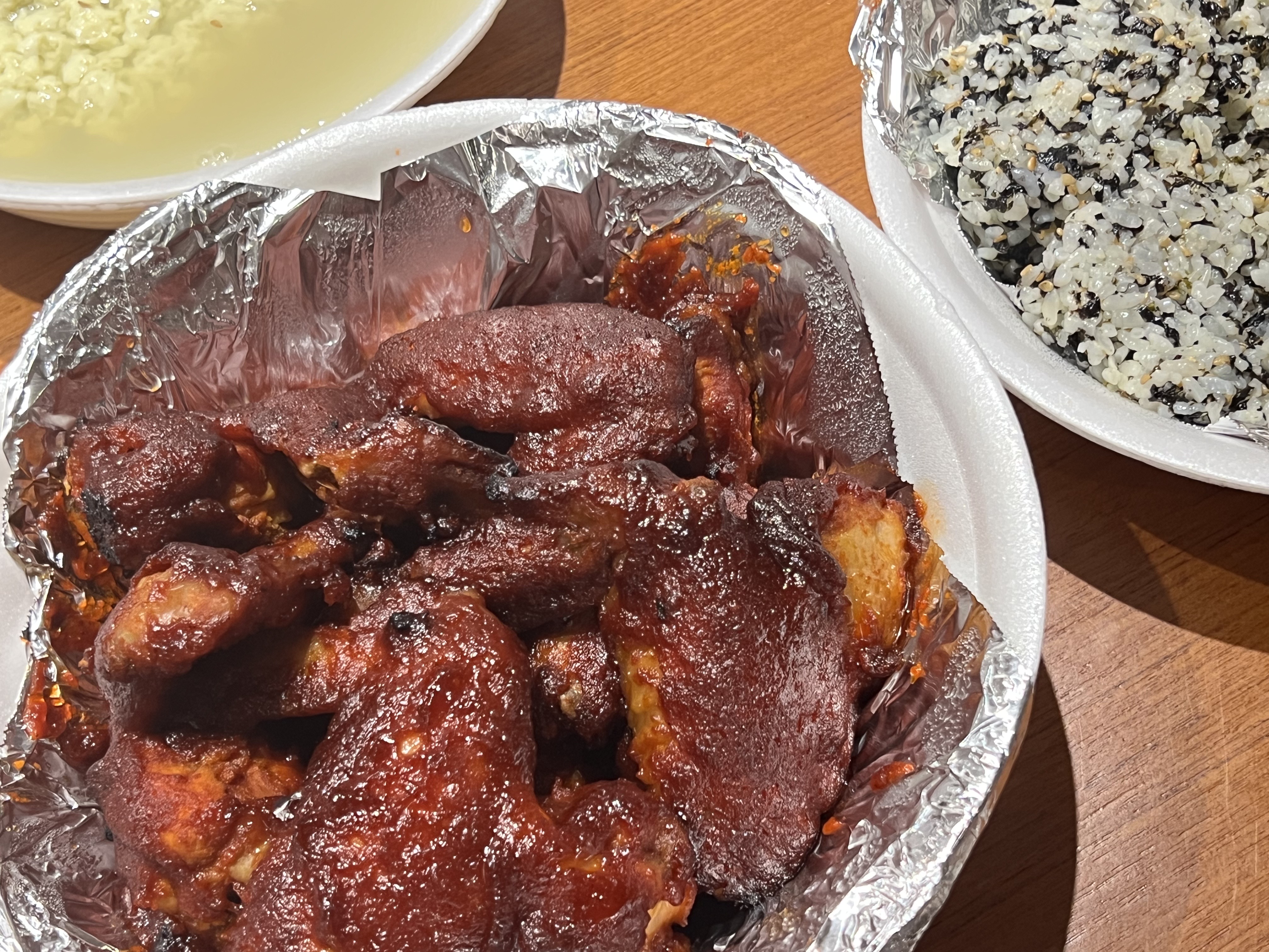 사정상 저는 테이크아웃 할 수밖에 없었지만, 여기 처음 방문하시는 분들은 꼭 매장에서 드시기를 추천드려요. 매장에서 먹어보고 포장해서 먹어보니, 매장에서 불판에 나올 때가 제일 맛있더라고요. 주먹밥은 이렇게 한 덩어리가 크게 나오는데 일회용 장갑으로 조물조물해 드시면 됩니다. 닭날개와 주먹밥은 정말 맛없없 메뉴네요.ㅠ.ㅠ