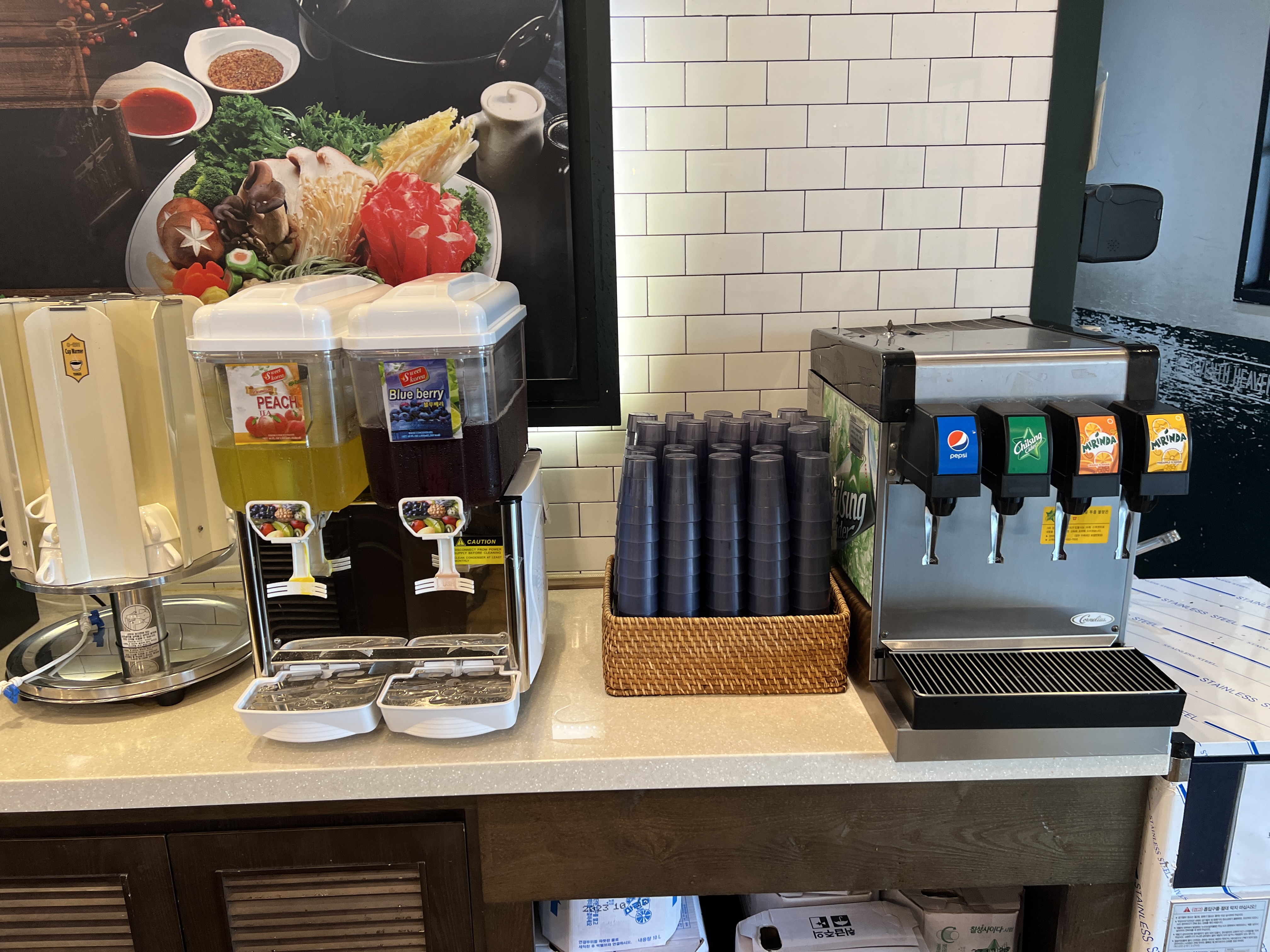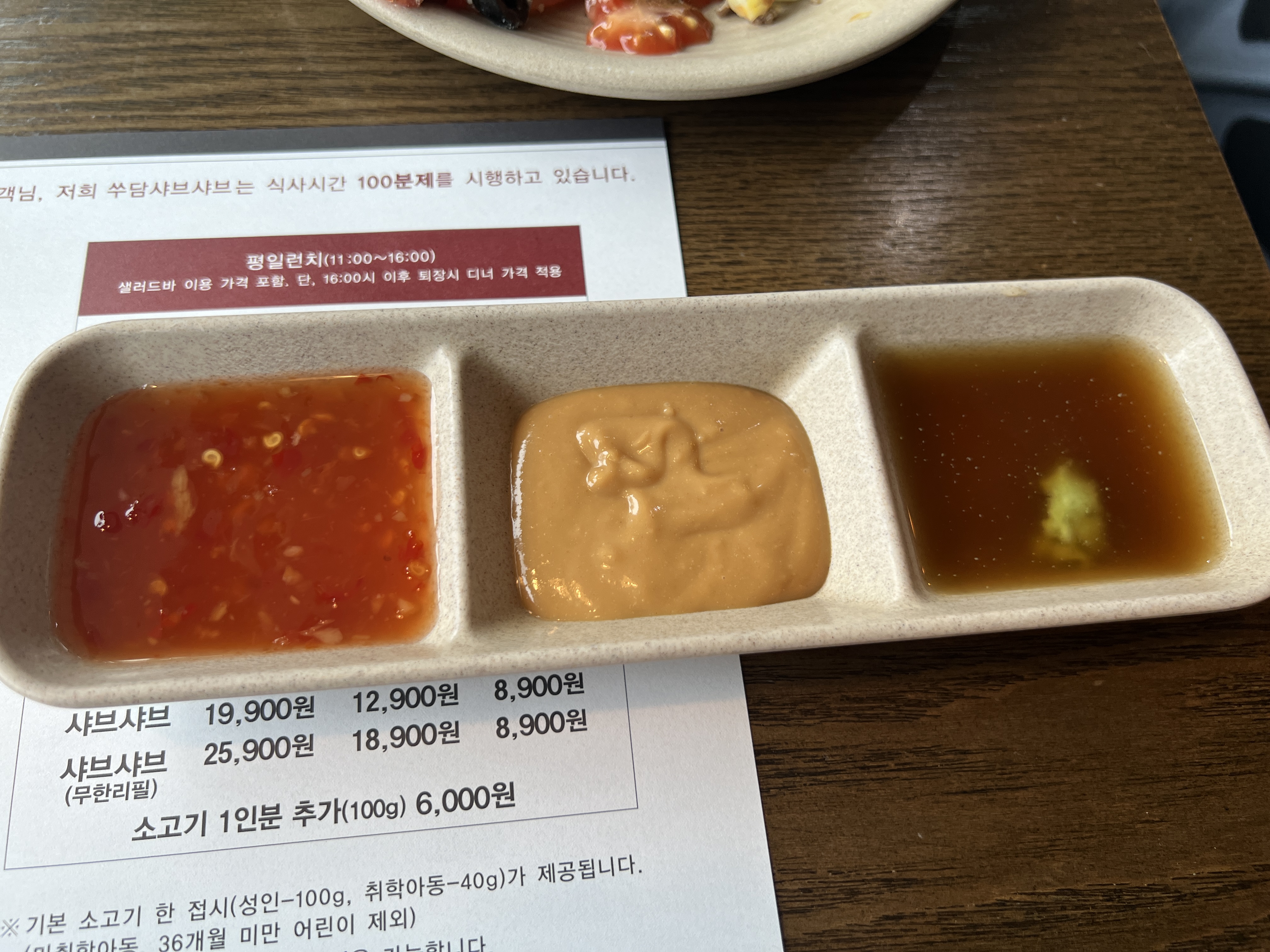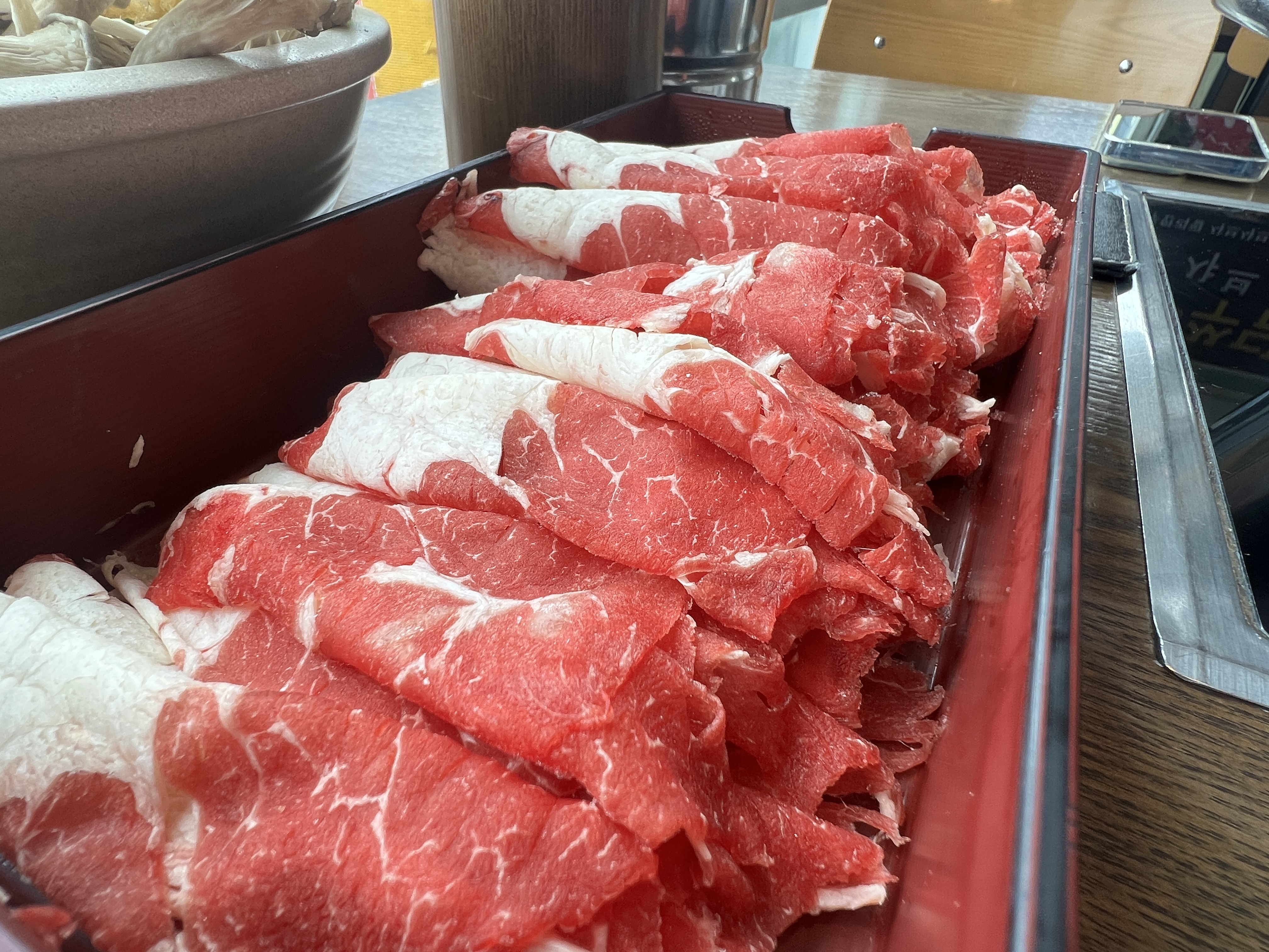 육수는 매운 것과 맵지 않은 거 두 종류가 있고요. 고기와 채소의 맛을 즐기려면 기본맛을 추천드려요. 저는 매운 거를 안 좋아해서 기본시킨 것도 있습니다 ㅎㅎ