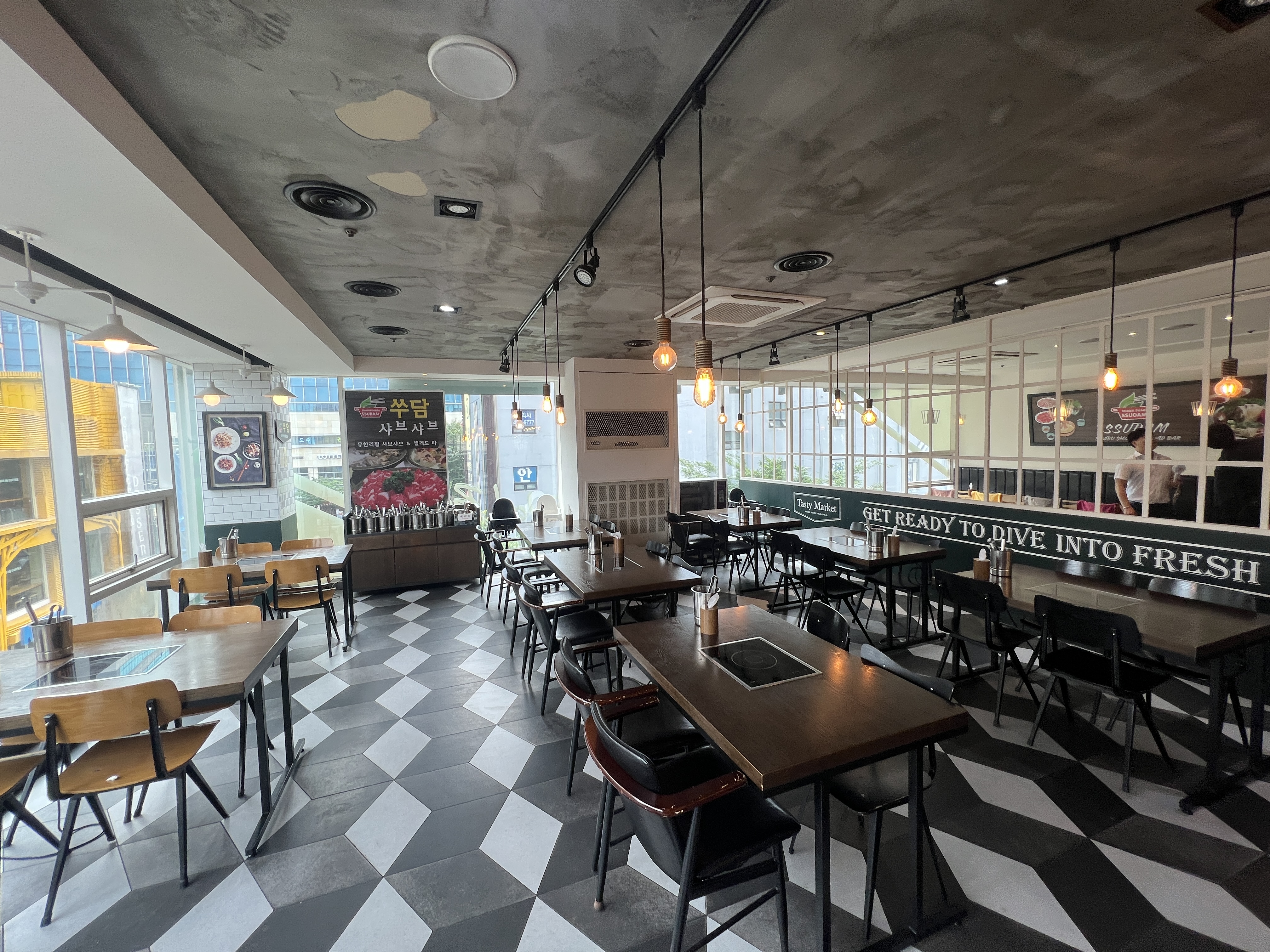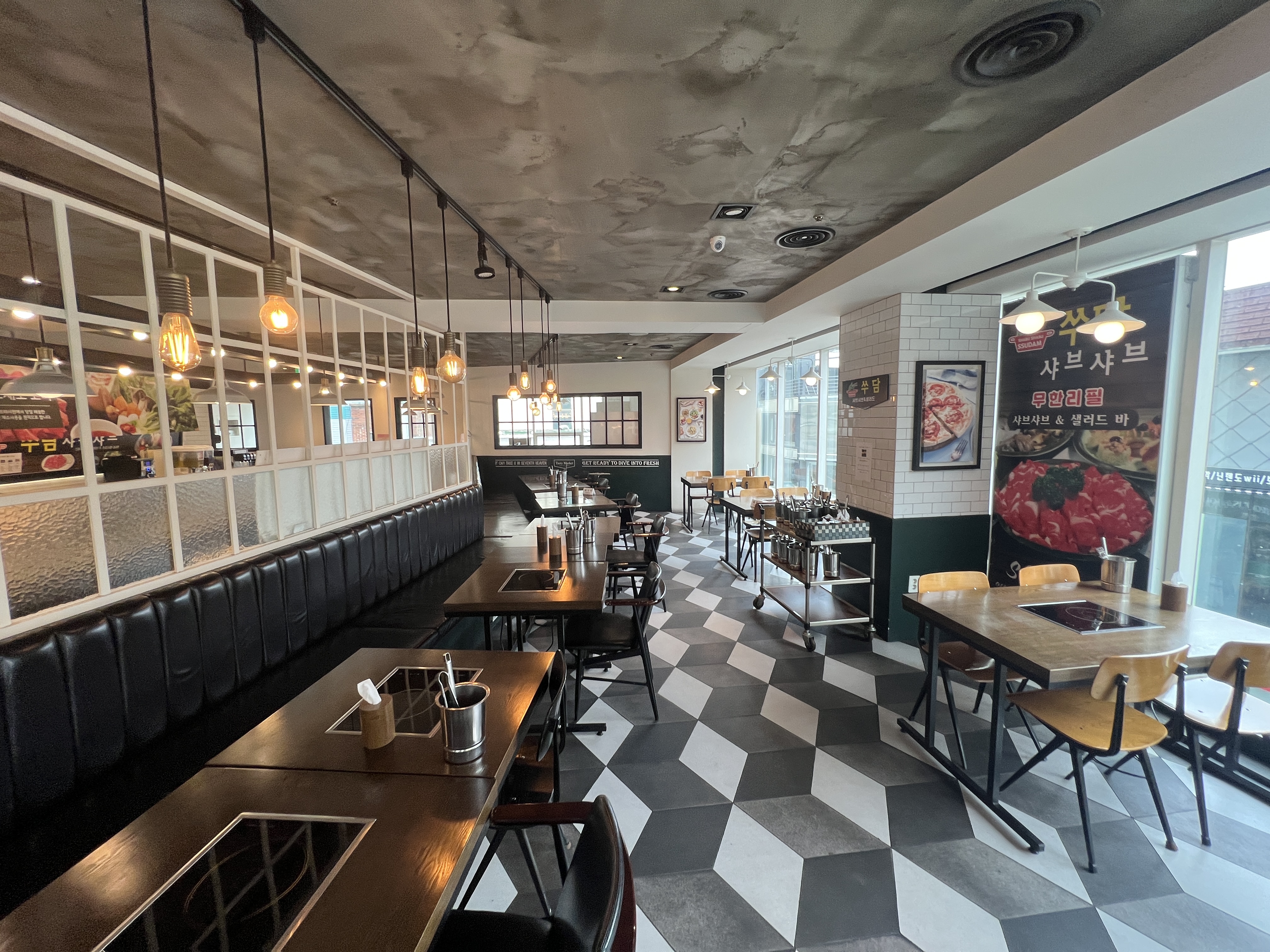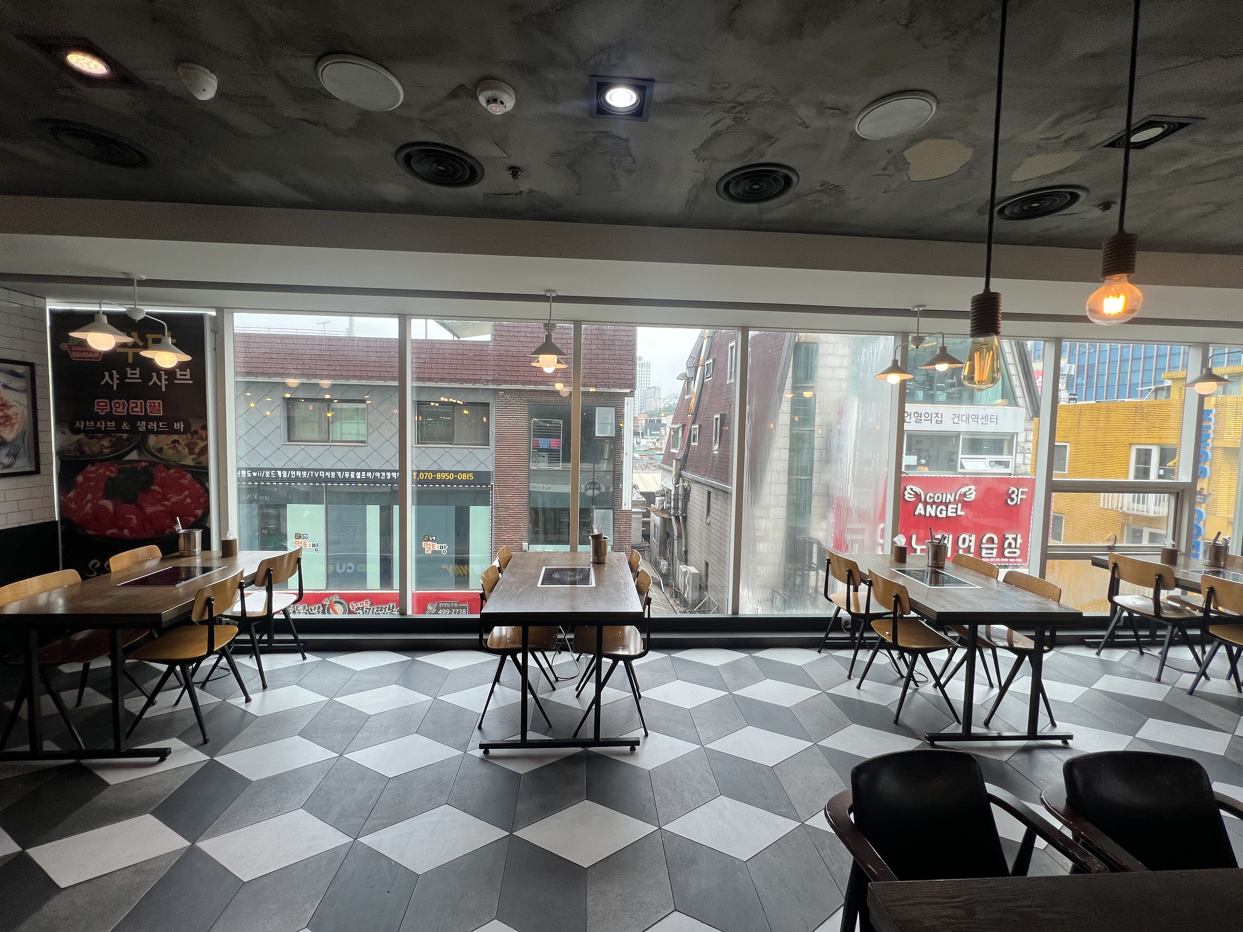 쑤담샤브샤브는 3층에 있는지라 건대 로데오거리뷰를 감상하며 먹을 수 있습니다 ㅎㅎ 개인적으로 한적한 평일 점심에 밝은 곳에서 식사하는 것을 좋아하는데, 딱 부합하는 곳이었어요. 건물은 다소 낡은 느낌이었으나, 쑤담샤브샤브 자체 식당 인테리어는 깔끔한 느낌이었어요.