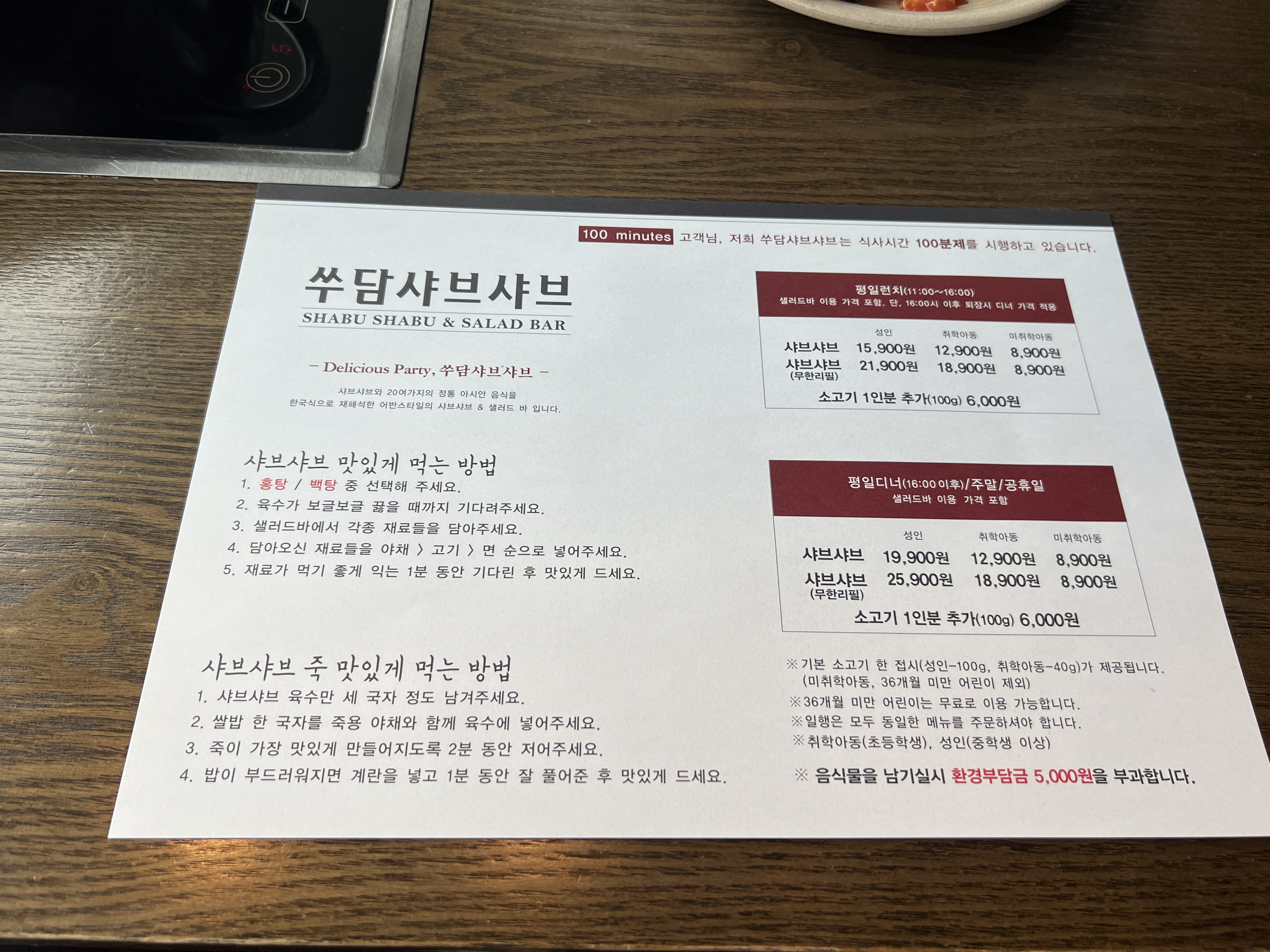 건대입구역 부근 상권은 주차하기 정말 힘든 지역입니다. 예전에 차 끌고 갔다가 3번 뺑뺑 돌고, 결국 건대 중심지와 도보로 15분 거리에 있는 광진구립 체육센터쪽에다가 차를 댄 기억이 있을 정도로 주차하기 힘든데요. 쑤담샤브샤브는 건물 내 무료주차 1시간 지원이 됩니다. 보다 느긋하게 먹는 샤브샤브 메뉴라는 특성과 무한리필도 가능하다는 점에서 1시간은 다소 부족합니다. 그래서 추가 주차비를 낼 수 밖에 없는 구조지만, 그래도 주차 걱정은 안 해도 되는 게 너무 좋고요. 그리고 주차요금도 그리 비싸지 않아서 다행입니다 ㅎ