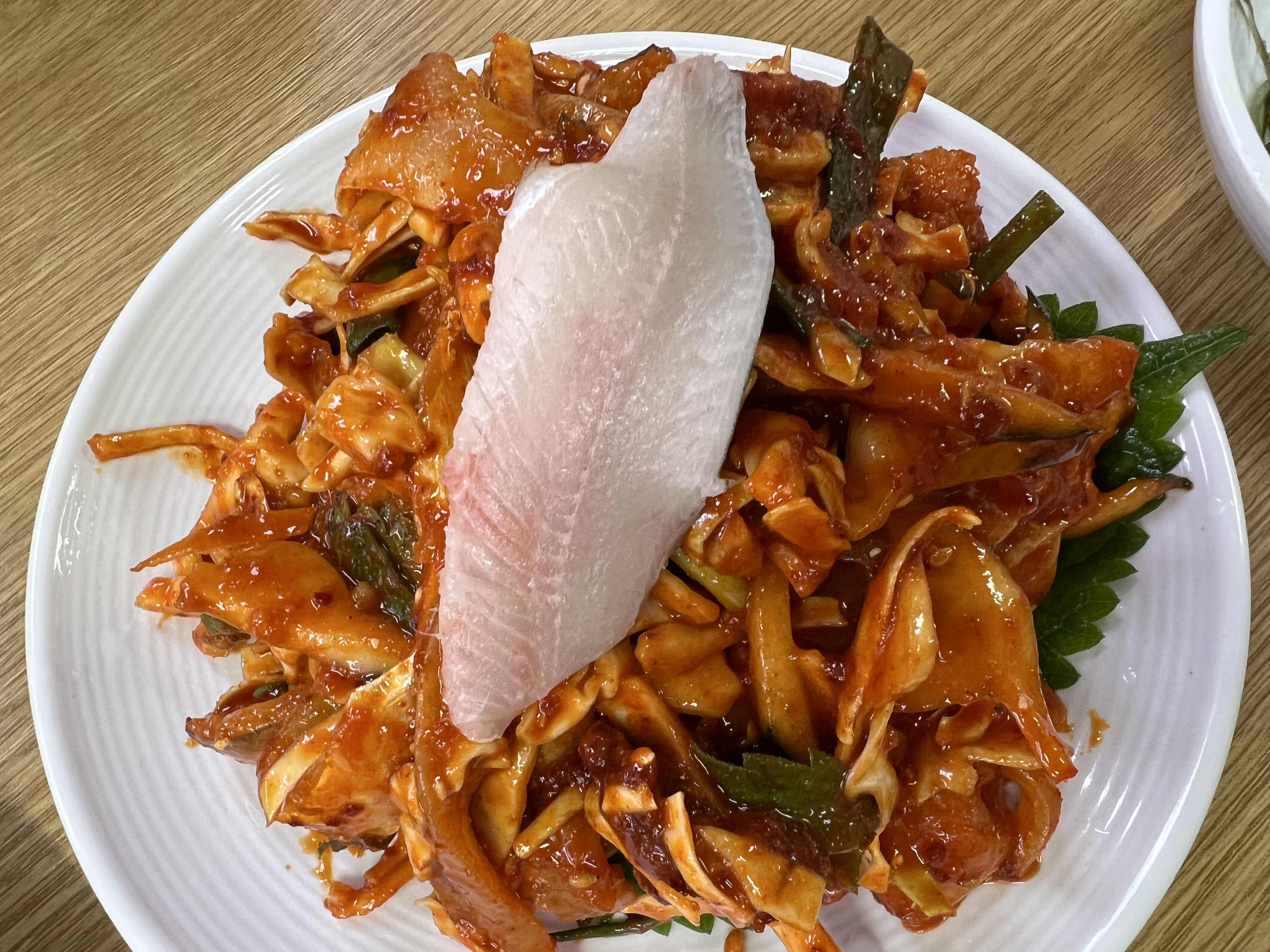 나름 횟감이 야채와 함께 버무려져 맛은 있어요. 다만 간이 매우 셉니다. 평소에 싱겁게 먹는 달꼬로서는 꽤나 자극적인 맛이더라고요. 회 맛으로 먹기보다는 양념맛으로 먹는 느낌?입니다.