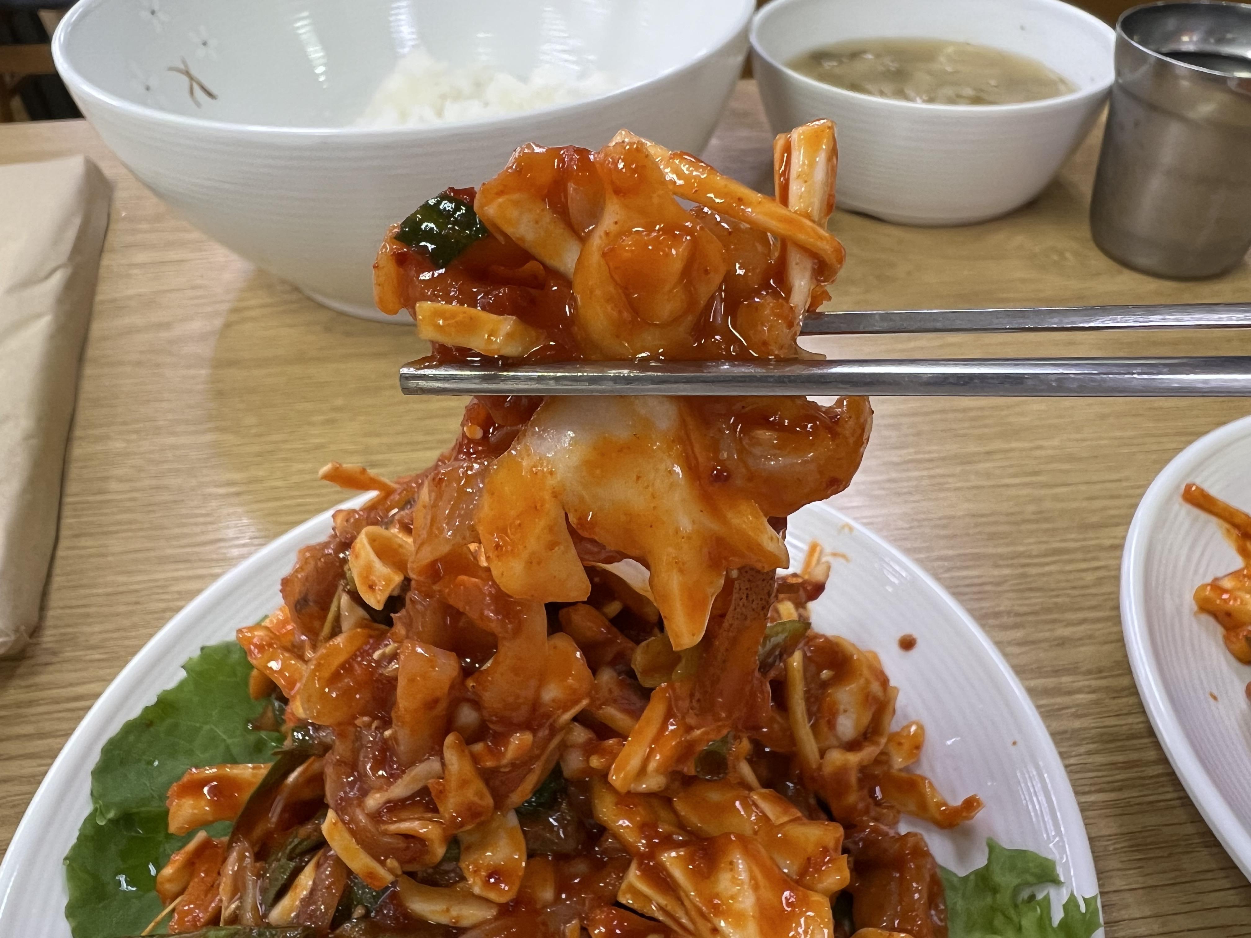 밴댕이 안 좋아하는 달꾸는 한치회무침으로 주문했습니다. 오징어 초무침 느낌인데, 그냥저냥 양념맛이 나쁘지 않은 회무침 느낌입니다. 금산식당에서 실패 없는 무난한 메뉴 먹고 싶다 하시면 한치회무침 주문하시면 될 것 같아요.