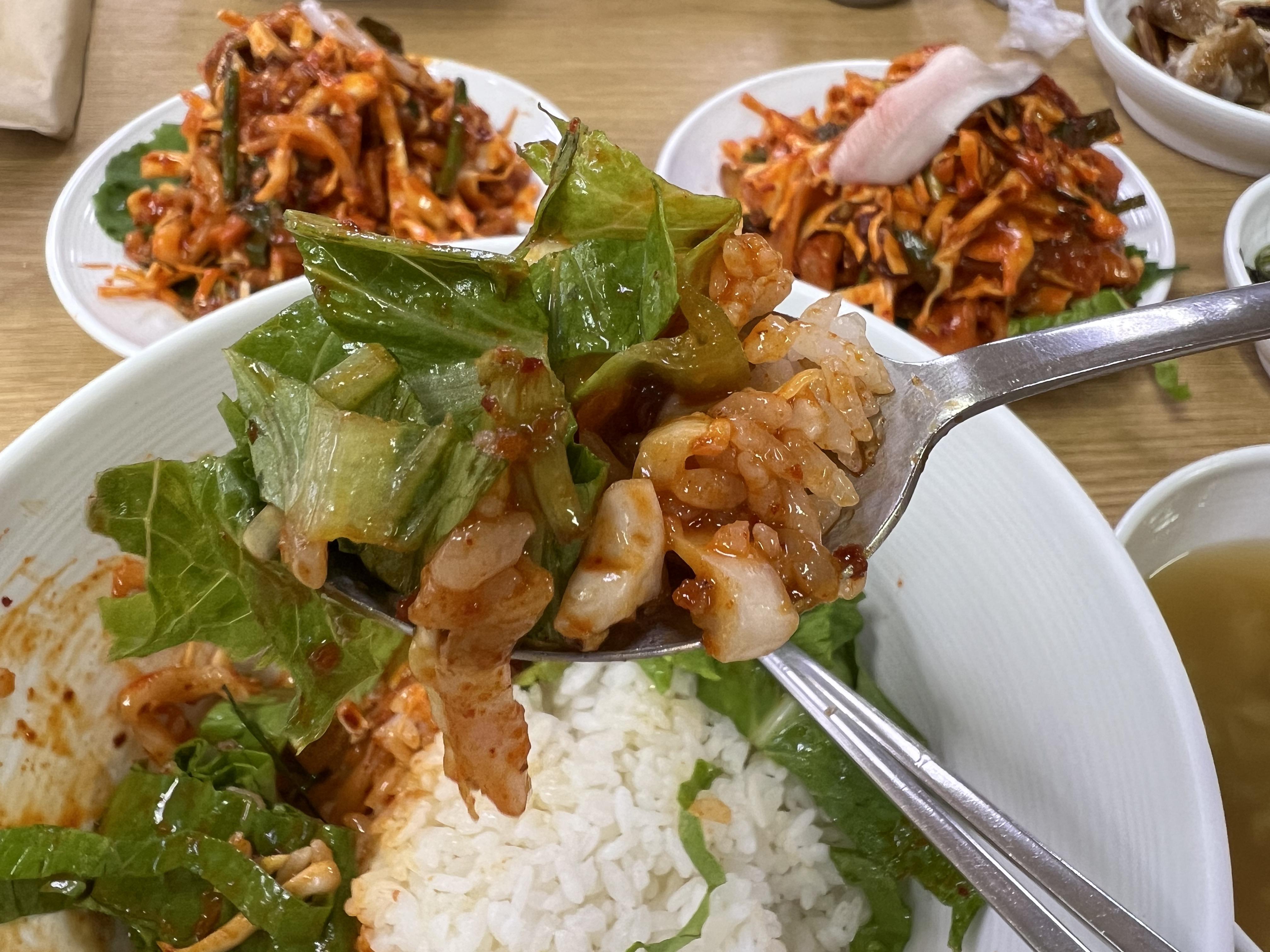 금산식당으로 검색하면 나오는 유명한 간장게장입니다. 간장게장만 잘 먹어도 본전은 뽑을 것 같지만, 막상 먹다 보면 회무침 자체가 간이 세서 간장게장도 손이 덜 가게 돼요. 살이 튼실하긴 합니다. 맛은 있는데 기본적으로 짜요.