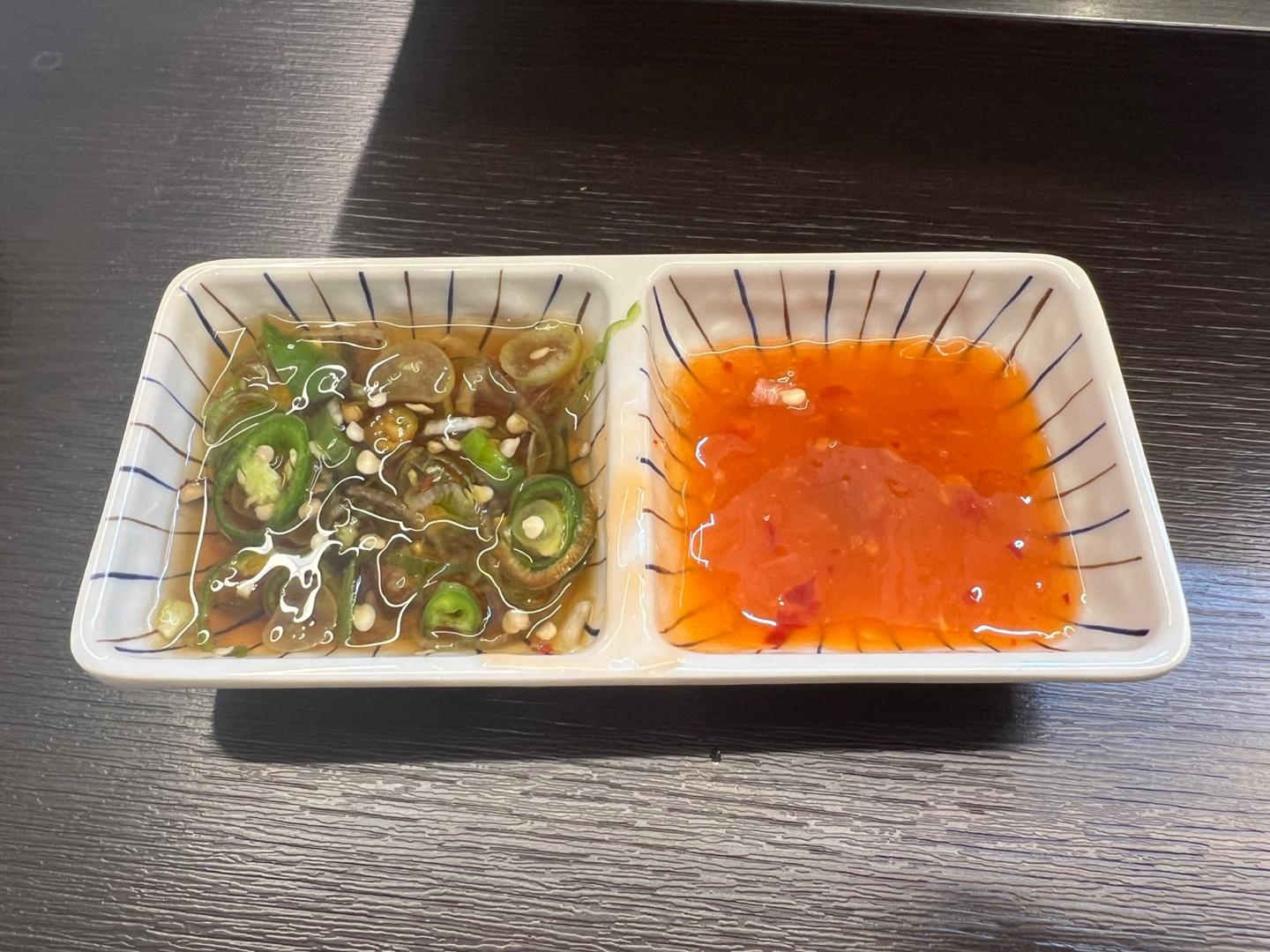 본론으로 다시 들어가자면 이 집은 저 간장 소스가 정말 맛있습니다. 게다가 같이 곁들이라고 고추와 파를 채썰어놓으셨는데요. 거기에 간장소스를 투하하면 됩니다. 고기의 느끼함을 싹 잡아주는 정말 훌륭한 소스였습니다.
