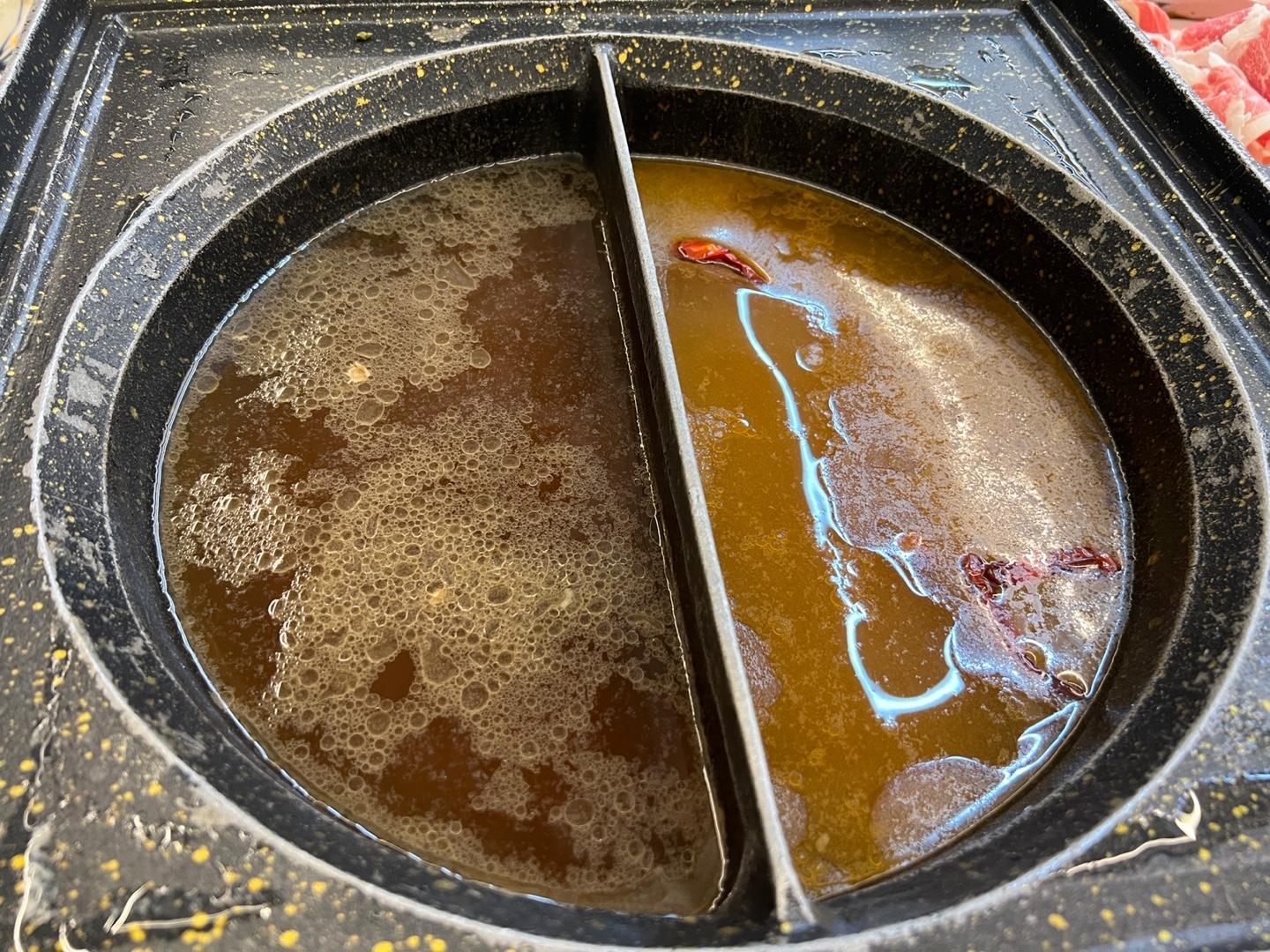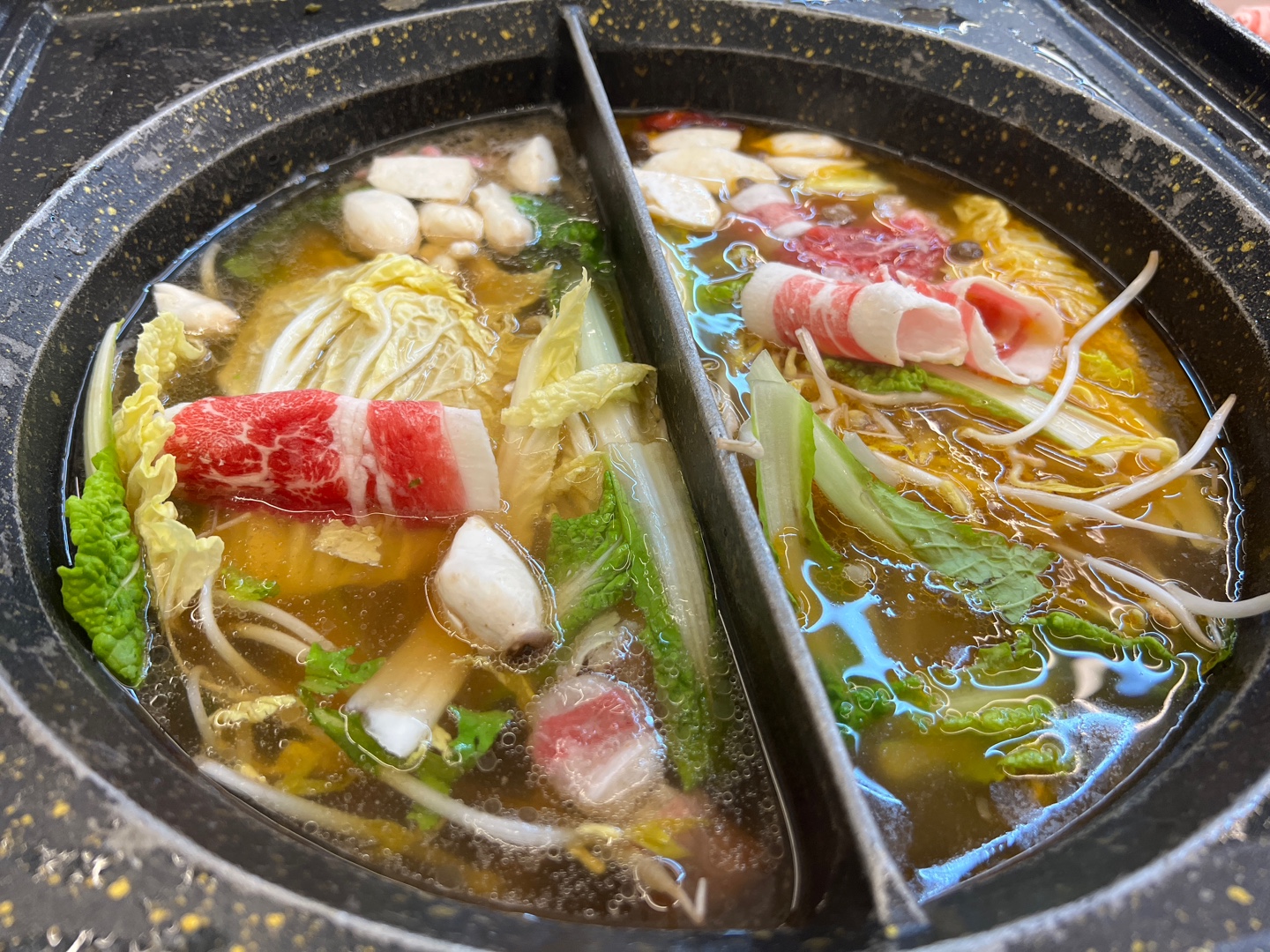 다 먹고나면 찜기를 빼달라고 점원한테 요청하시면 됩니다. 다음으로는 샤부샤부를 즐길 수 있게 밑에 육수가 있는데요. 이미 편백나무찝에서 우러나온 육즙과 채즙이 육수에 빠져 있어서 바로 고기와 야채를 투하해서 드시면 됩니다.