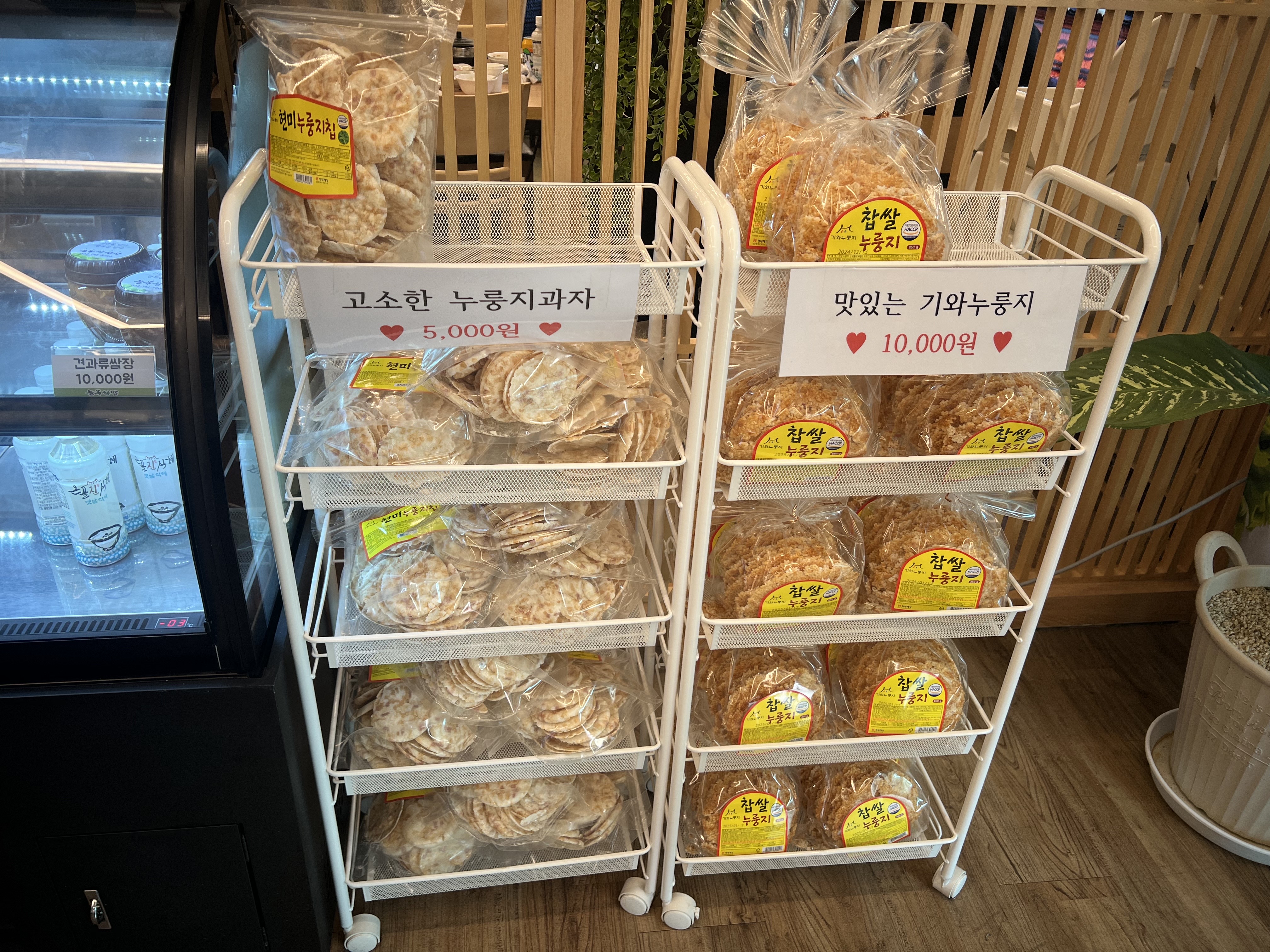 식사 후 어르신들 입가심으로 하기 좋은 추억의 누룽지과자도 판매 중이에요.