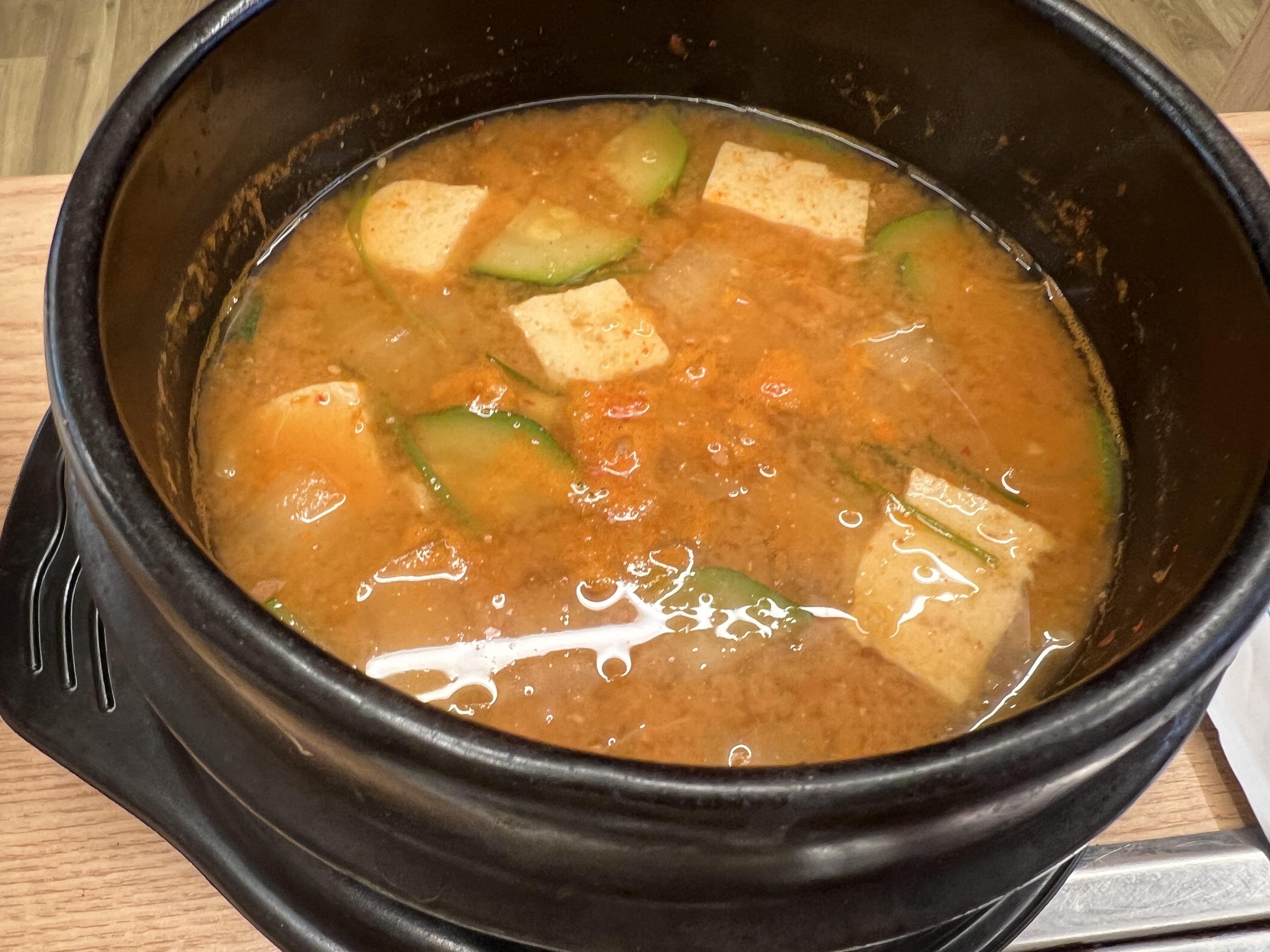 칼칼하고 얼큰한 맛의 된장찌개입니다. 맑은 느낌의 장국은 아니고, 얼큰하고 진한 느낌의 된장찌개라 쌈밥과 잘 어울려요.