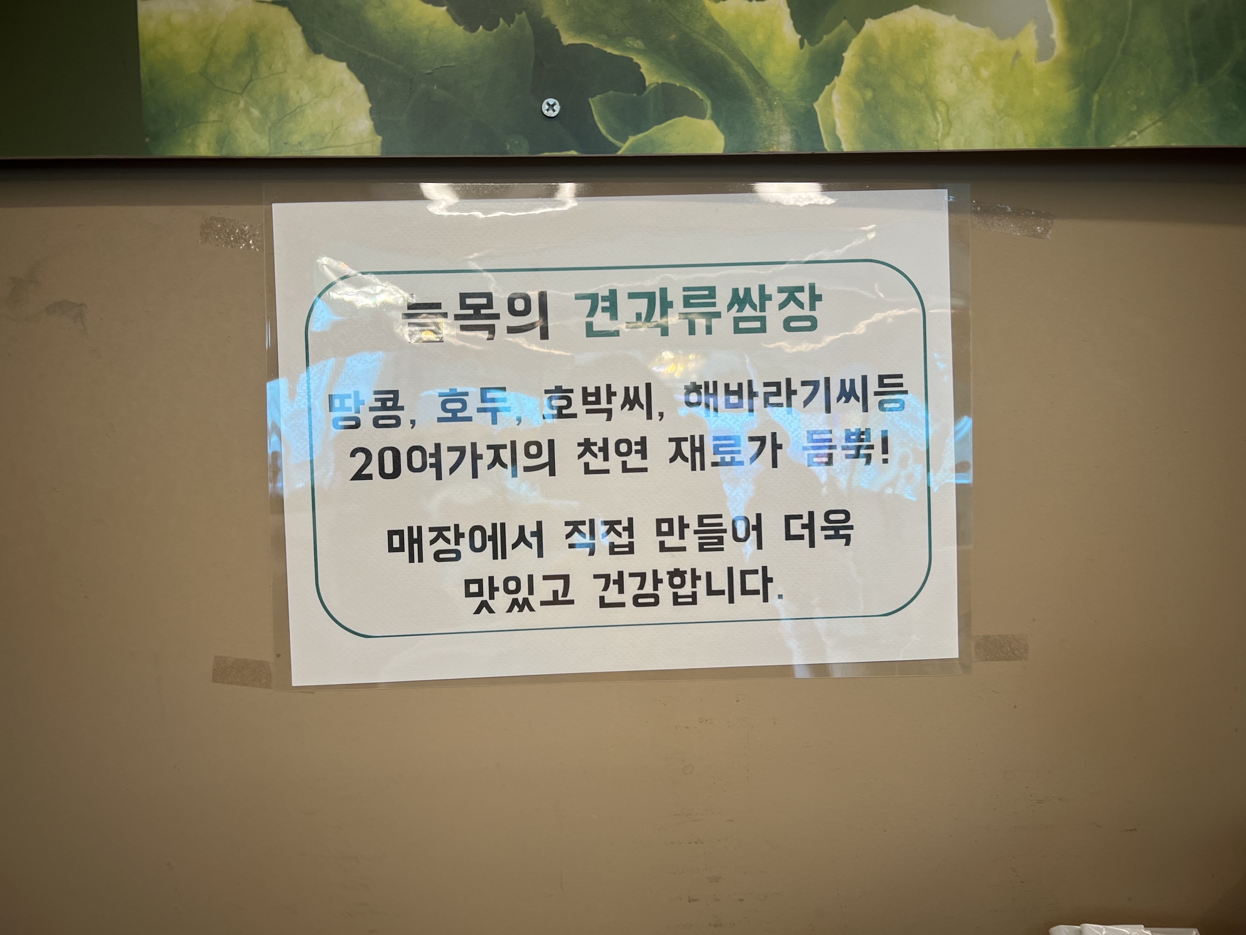 늘목쌈밥에서 사용하는 쌈장에 대한 설명입니다. 다양한 견과류 등 천연재료가 듬뿍 들어가서 더 맛있다고 하네요. 우연히 온 곳인데 뭔가 정성이 가득한 느낌이에요.