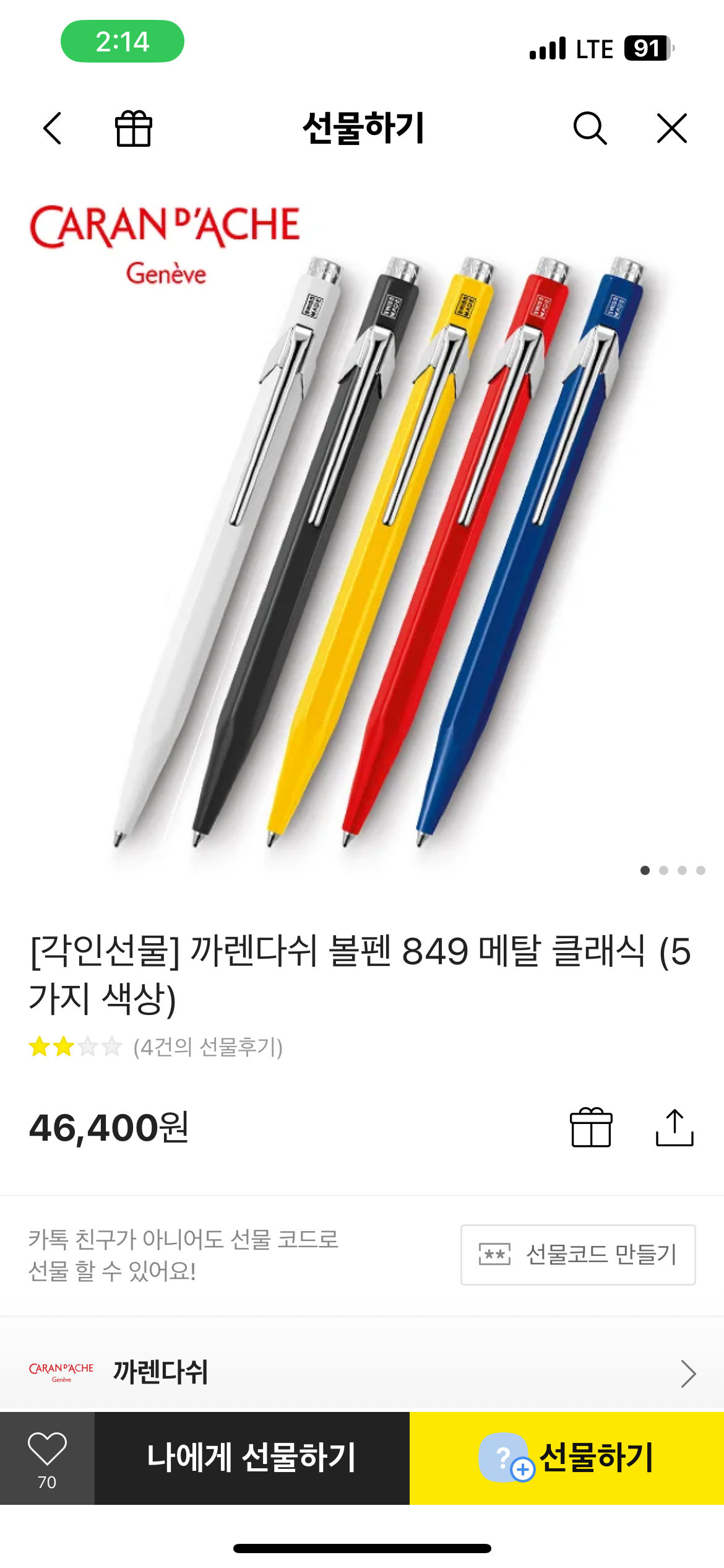 오늘 포스팅하려는 제품은 바로 까렌다쉬라는 브랜드의 볼펜이에요. 카카오톡 선물하기에서 가격은 46,400원으로 판매 중이고 다양한 색상을 고를 수도 있어요. 저는 클래식 색상을 선물 받았지만, 최근 블루라군 에디션이나 로즈골드 색상도 출시가 되었으니 다양하게 취향에 맞게 선물하시면 좋을 것 같아요.