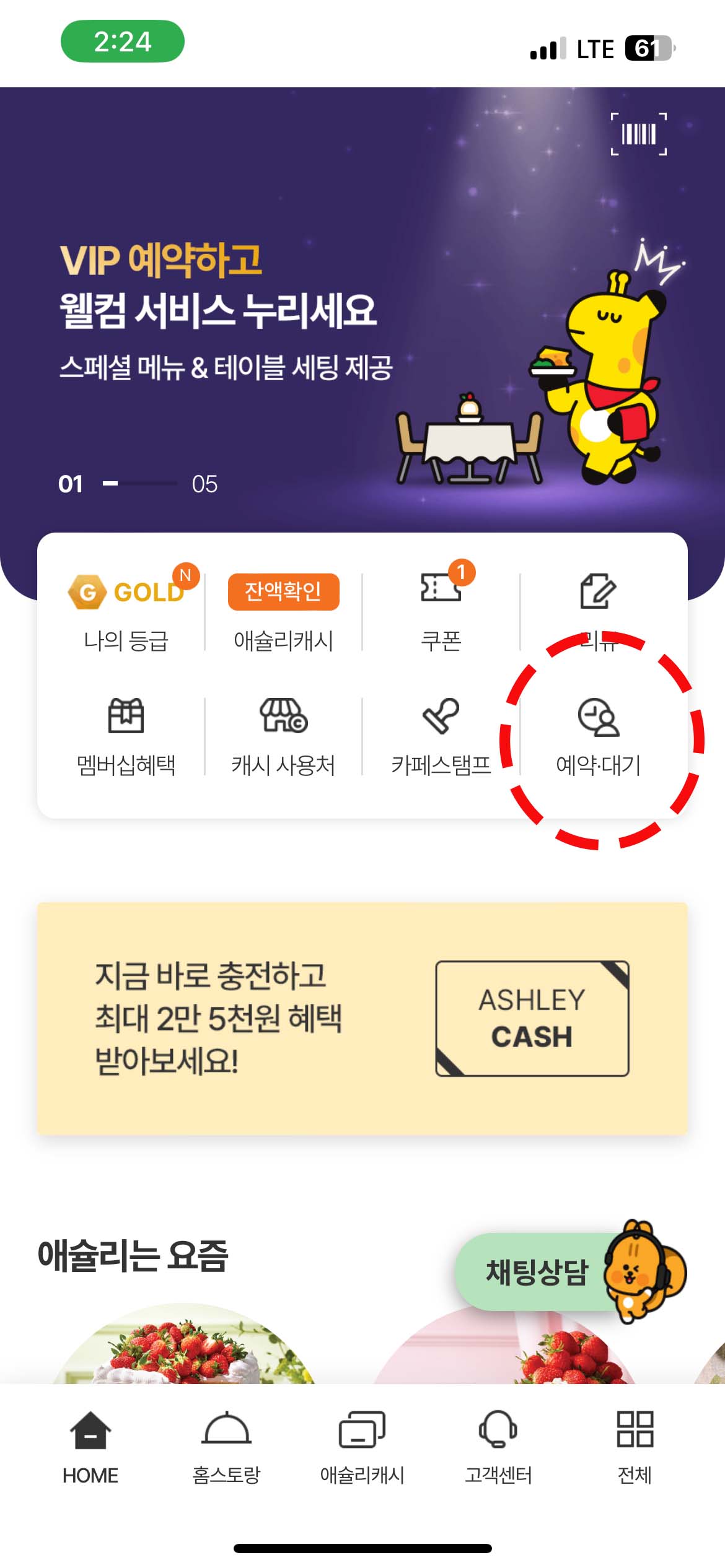 애슐리를 이용하시려면 이렇게 애슐리 앱을 미리 설치하시는 게 좋은데요, 애슐리 앱을 통해서 미리 대기예약도 할 수 있고 애슐리 캐시를 충전하면 약간의 혜택도 있기 때문에 애슐리앱 설치를 강력 추천드려요. 애슐리 앱 첫 화면에 표시해 둔 대기예약 버튼을 통해서 매장에 방문하기 전에 미리 대기예약을 해 놓을 수 있어요.