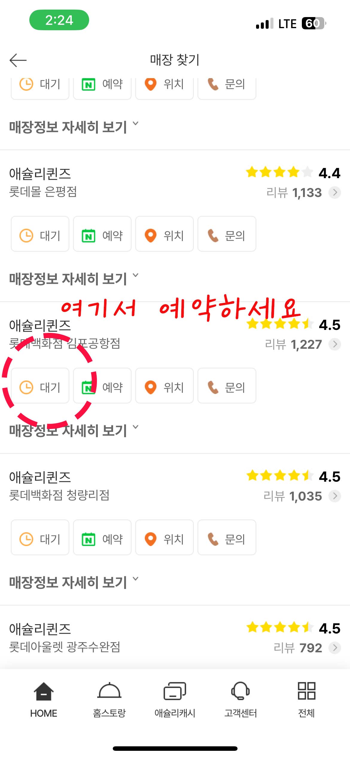 애슐리 앱에서 대기예약 버튼을 누르면, 지점별 대기현황을 보고 대기를 예약할 수 있어요. 이렇게 편리한 시스템이 있었다니, 예전에 현장대기하던 때가 새록새록 떠오르네요. 실제로 애슐리엡에서 대기예약을 하니, 김포공항 롯데몰에 도착하자마자 거의 바로 입장할 수 있어서 너무 편리했어요.