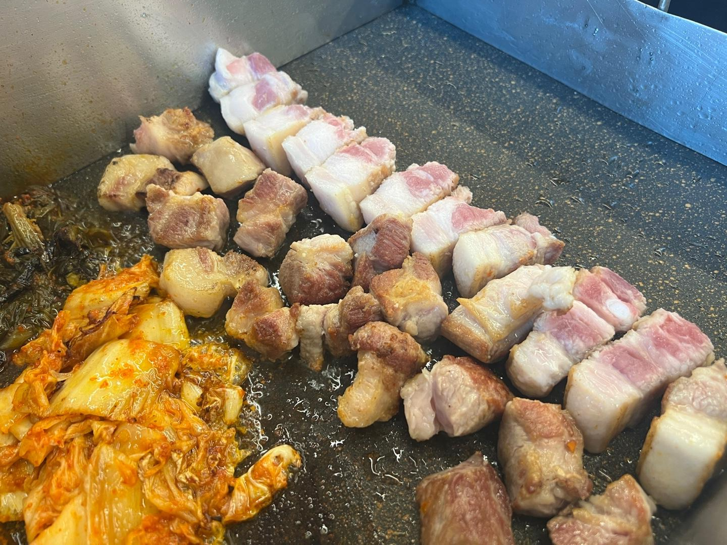 특히, 이 집은 배운 집이라는 게 기름이 이렇게 쭉쭉 빠지는 길목에 김치를 구워주시기에 맛없없입니다. 맛이 없을 수 없는 상황에서 맛있게 담근 김치를 구워주시니까요. 맛은 보증되었다고 보시면 됩니다.