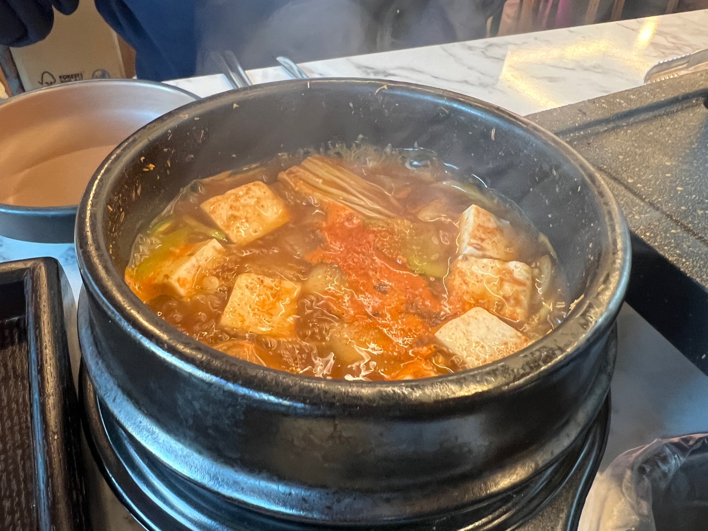 이 날 둘이서 가서 김장세트(51,000원)로 주문했고요. 딱 배불리 먹을 수 있는 양이었는데요. 세트 구성에 이렇게 계란찜과 된장찌개를 주십니다. 특히 저 된장찌개는 게까지 들어있어서 정말 국물이 시원하고 맛있었습니다.