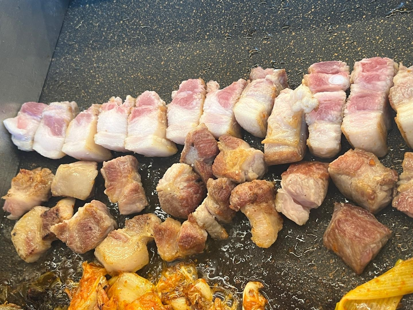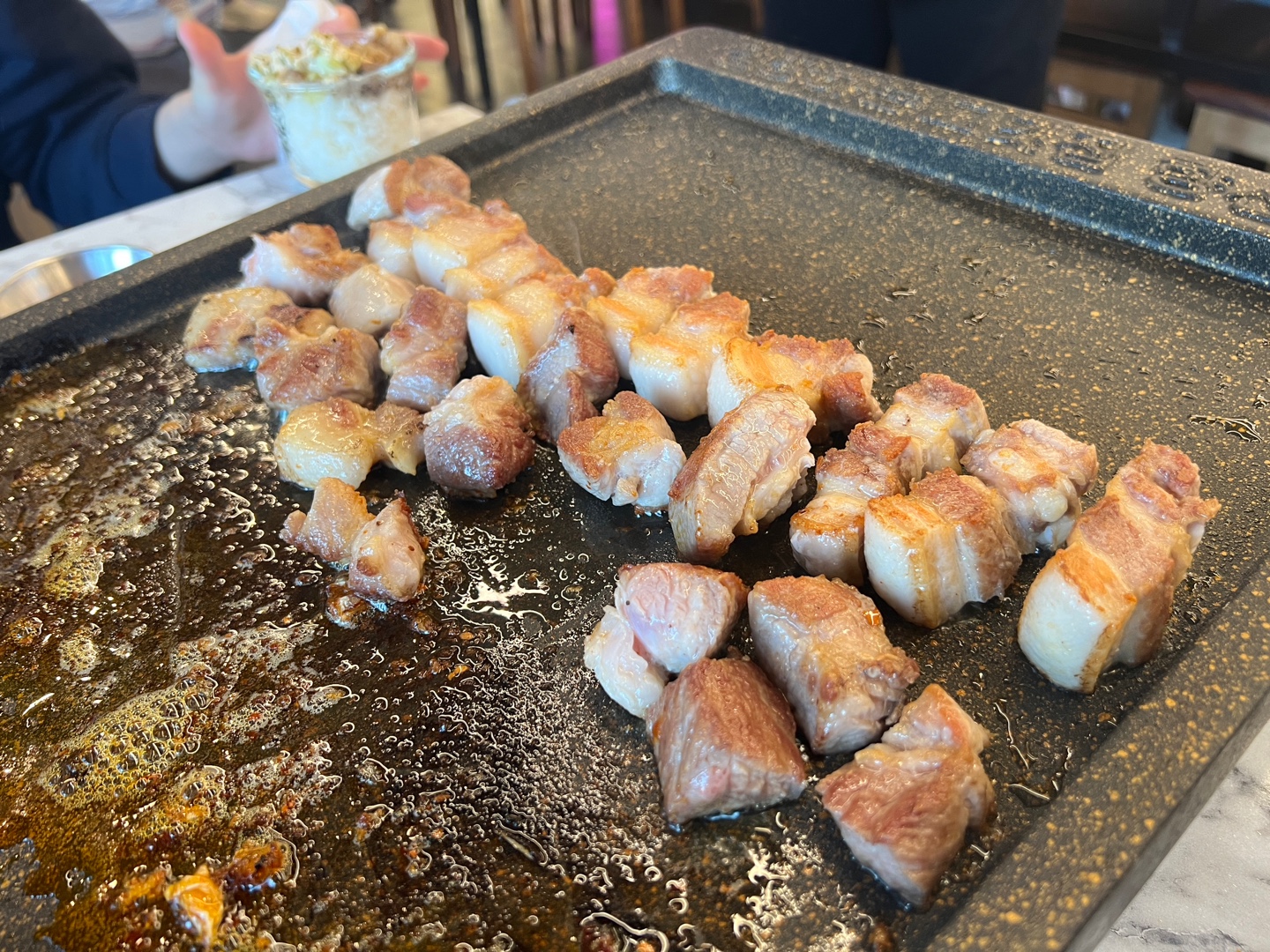 고기가 너무 맛있어서 삼겹살을 추가해서 먹었습니다. 고기맛은 두툼하게 구운 만큼 육즙을 잡으면서 직원분이 구워주시기에 마이야르를 일으킨 채로 정말 딱 맛있을 때 내어주시기에 진짜 맛이 좋았습니다. 고기 자체로 상급으로 말할 수 있을 정도인데, 여기에 다양한 김치를 곁들여 먹으니까 정말 맛있었습니다.