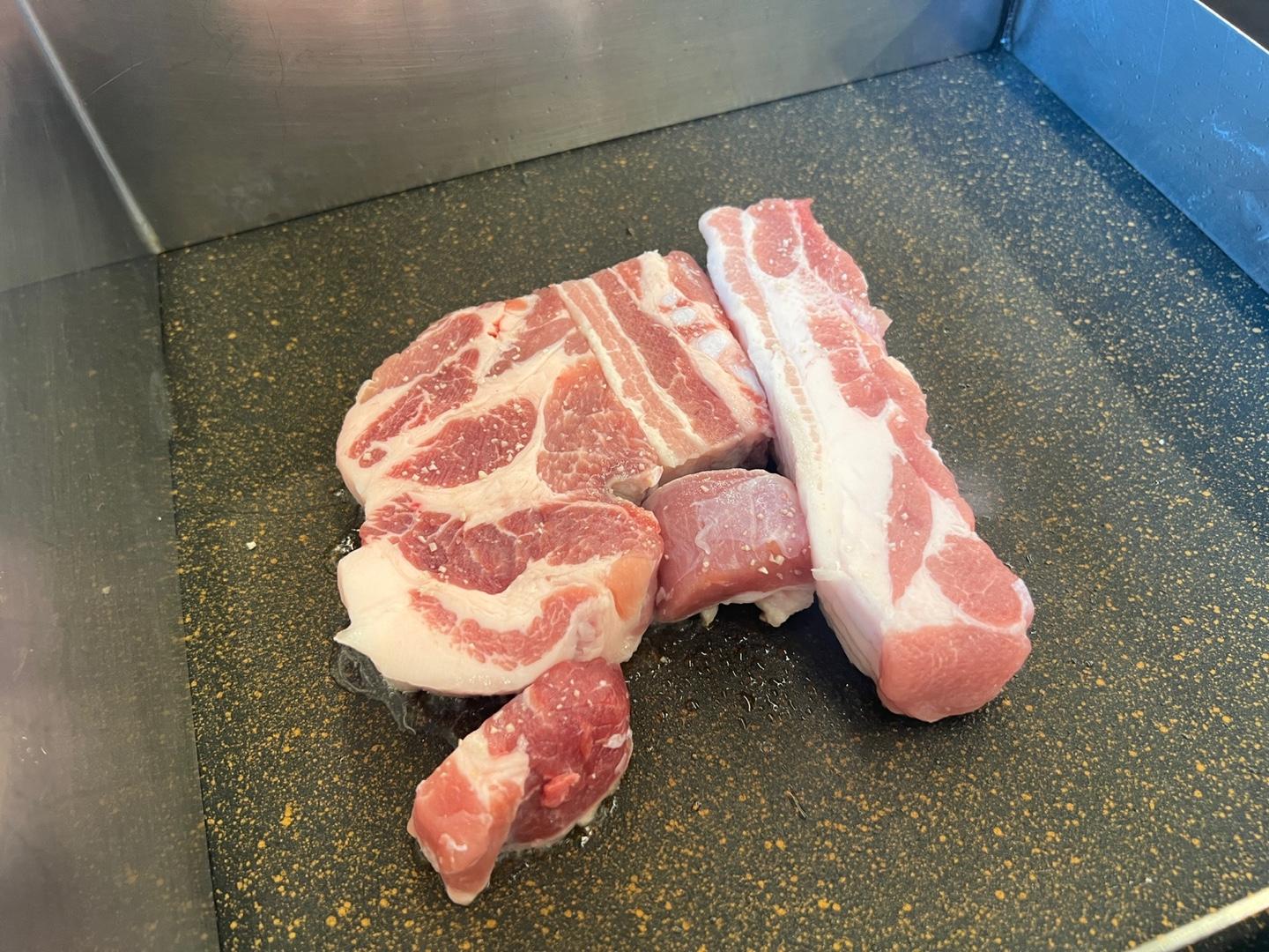 주문한 목살과 삼겹살이 나왔습니다. 모든 걸 다 직원분이 구워주시는데요. 저 고운 때깔 보이시나요. 고기질이 일단 미쳤습니다. 고기가 맛이 없을 수 없는 마블링과 육 색이었습니다.