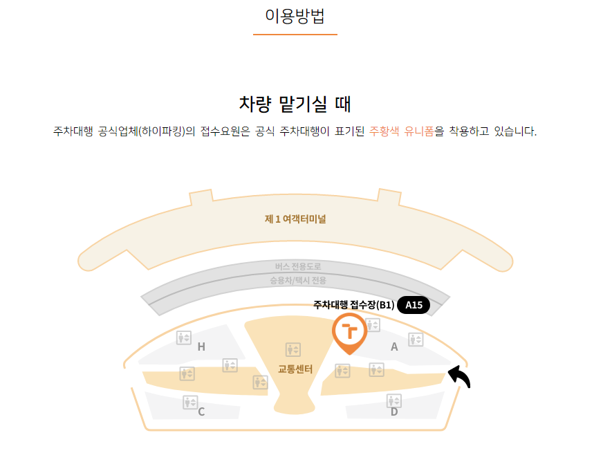 공항 건물 지하에 있는 지하 1층 단기주차장 들어가셔서 led 전광판과 곳곳에 설치된 배너를 보시고 따라가시면 됩니다. 진짜진짜 헛갈리지 않게 안내가 꼼꼼히 되어 있어요. 전방만 주시해서 가시면 됩니다 ㅎㅎ 정신 안 차리시면 이상한 곳으로 가시니까 집중만 하시면 돼요 ^^ 쭉 코스대로 들어가시면 업체 요원이 안내해 주시고 정차 후 키만 두고 내리시면 됩니다. 그리고 발레 접수증 받으시면 되세요.