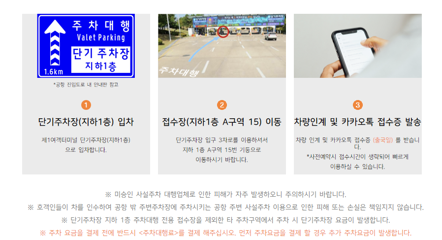 곳곳에 주차대행 관련 안내문과 주차비 결제 기기가 있고요. 키 인도받으시면 주차된 장소가 적혀있는 메모지를 주세요. 거기에 적혀 있는 주차구역에 따라가시면 됩니다. 차량 찾는 시간 10분도 안 걸리고요. 덕분에 쾌적하게 여행했습니다. 이상으로 후기 마치겠습니다.