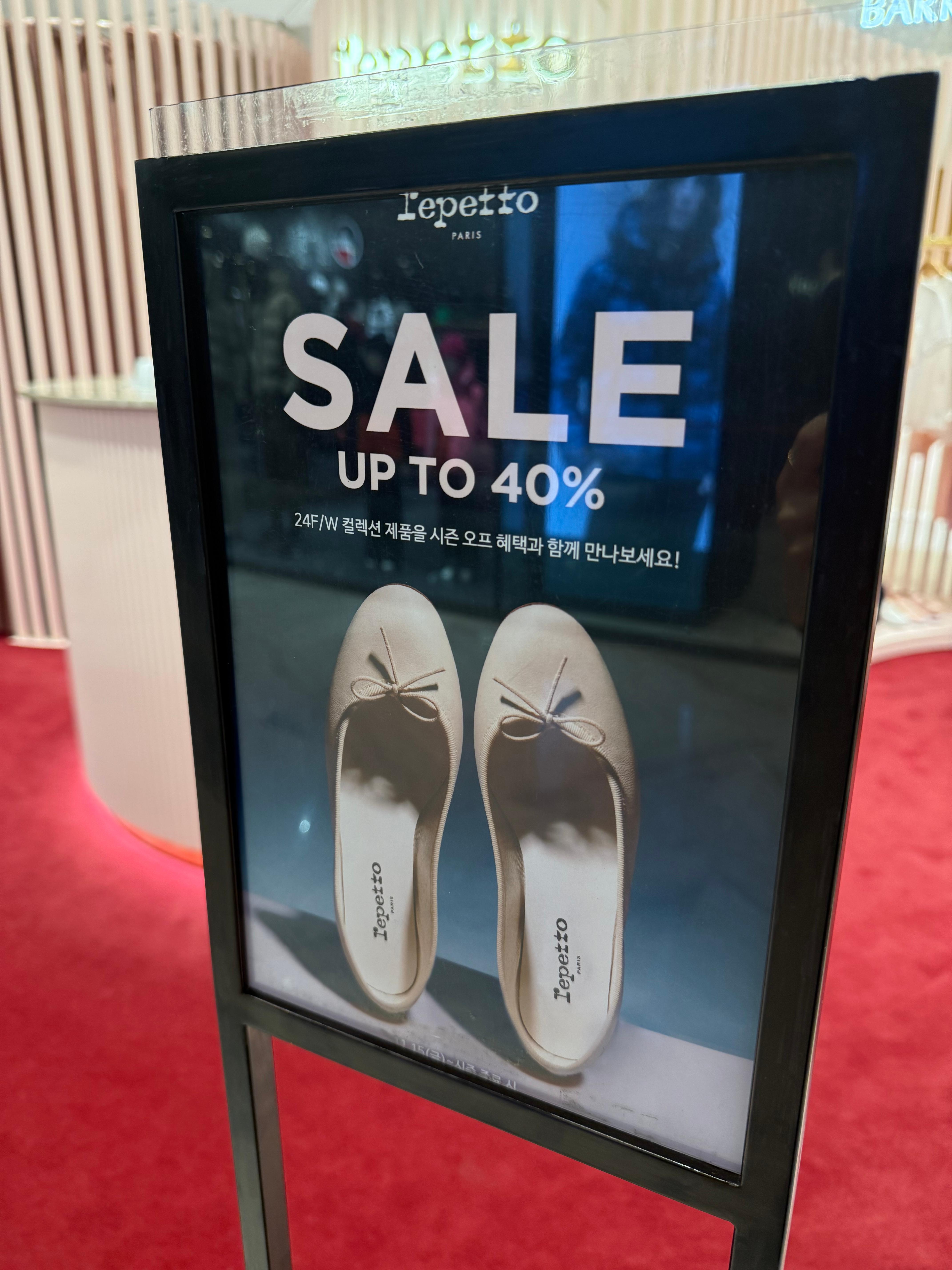 지금 월드타워점에서 레페토 슈즈 이월상품 세일 중이라고 하니 조금이라도 저렴하게 구매하시려는 분들은 이번 주말에 방문해보시는 것이 좋을 것 같아요. 40%까지 할인률이 커서 그런지 세일 재고가 얼마 남지않았고, 거의 디피상품이긴 하더라고요. 보편적인 사이즈도 거의 다 품절인 것 같긴합니다.