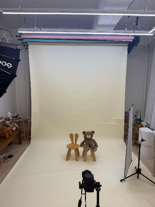 사진관 크기는 아담한 편입니다. 다른 직원분 없이 사장님이 혼자서 응대하셨고, 예약시간에 맞춰서 간단한 설명을 해주신 후, 바로 사진 촬영에 들어갔습니다. 이렇게 한 켠에 사진 촬영 공간이 있고, 귀여운 의자에 애기를 앉혀서 촬영을 시작했습니다.